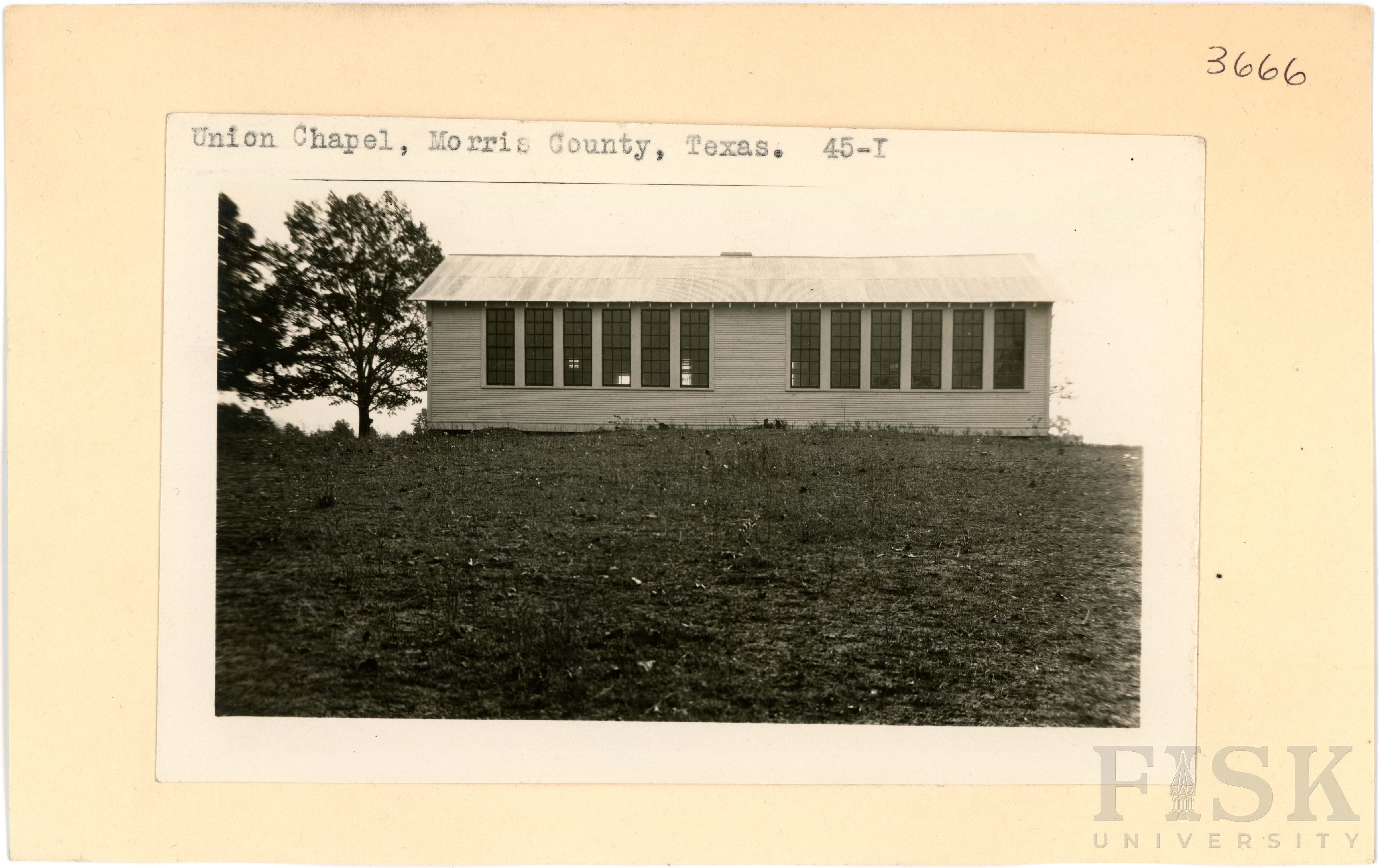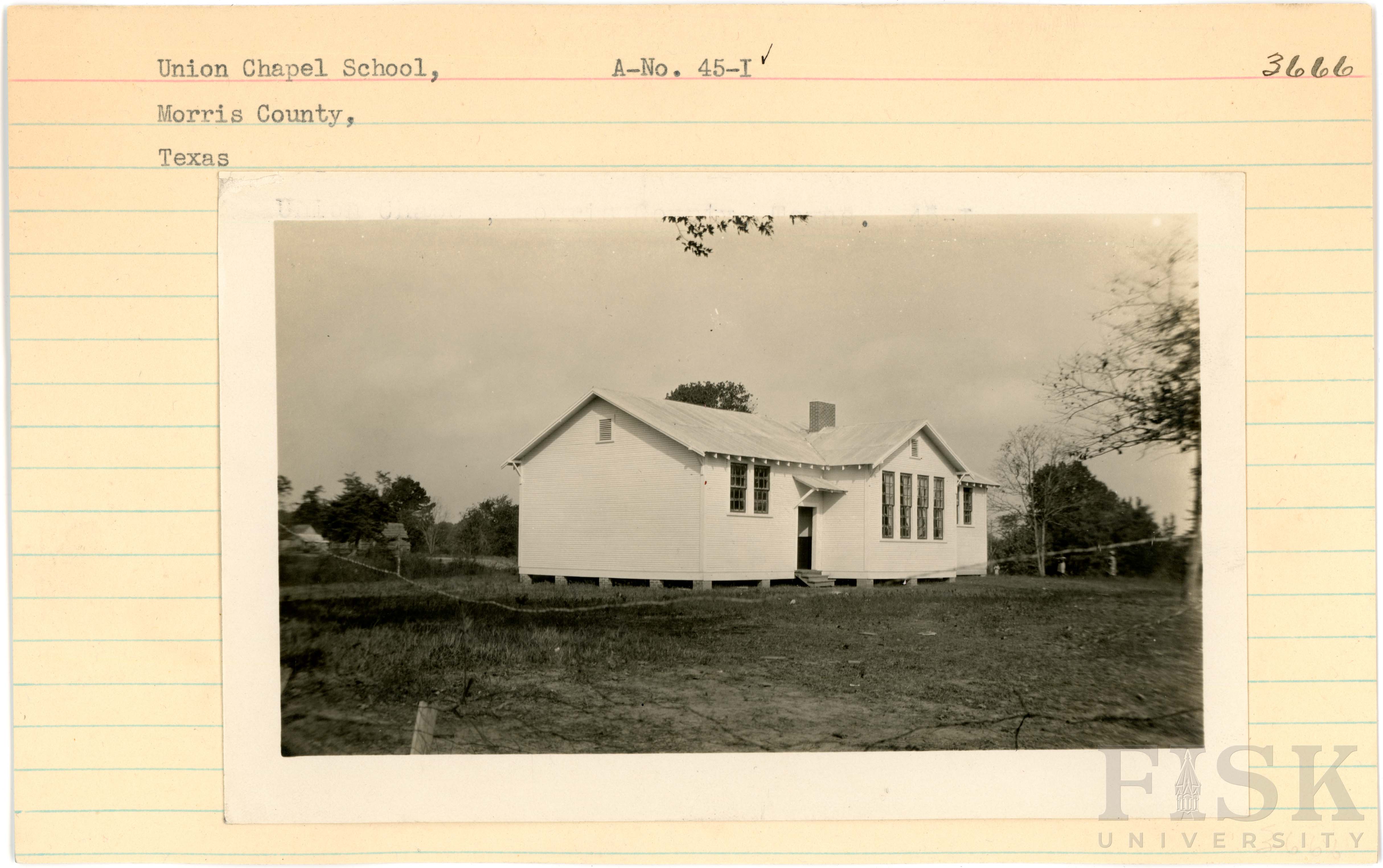 - Photo of Union Chapel School in Morris County, Texas on the front of the school card; photo of Union Chapel School in Morris County, Texas on the back of the card with an inscription that says, "Union Chapel, Morris County, Texas. 45-T"