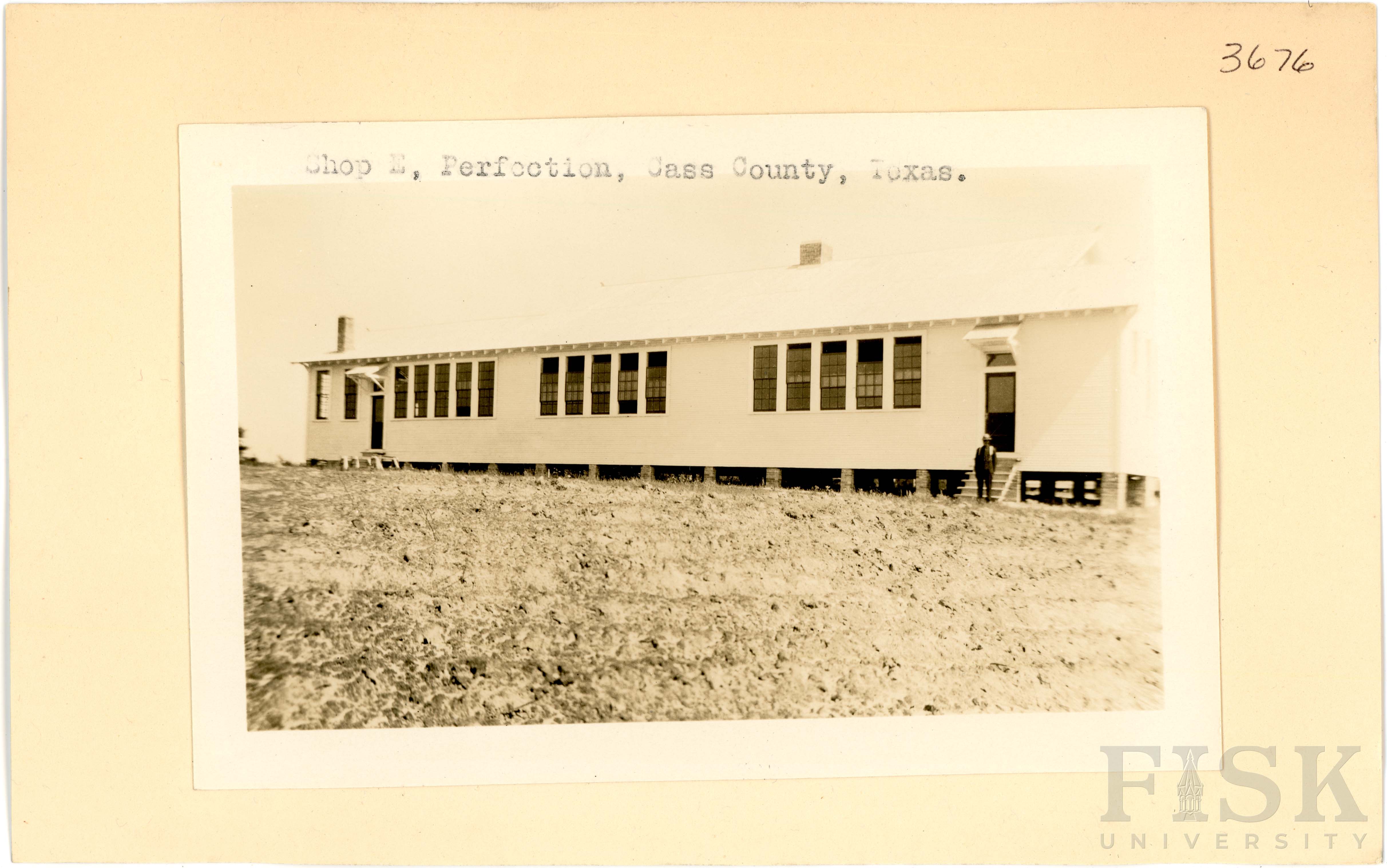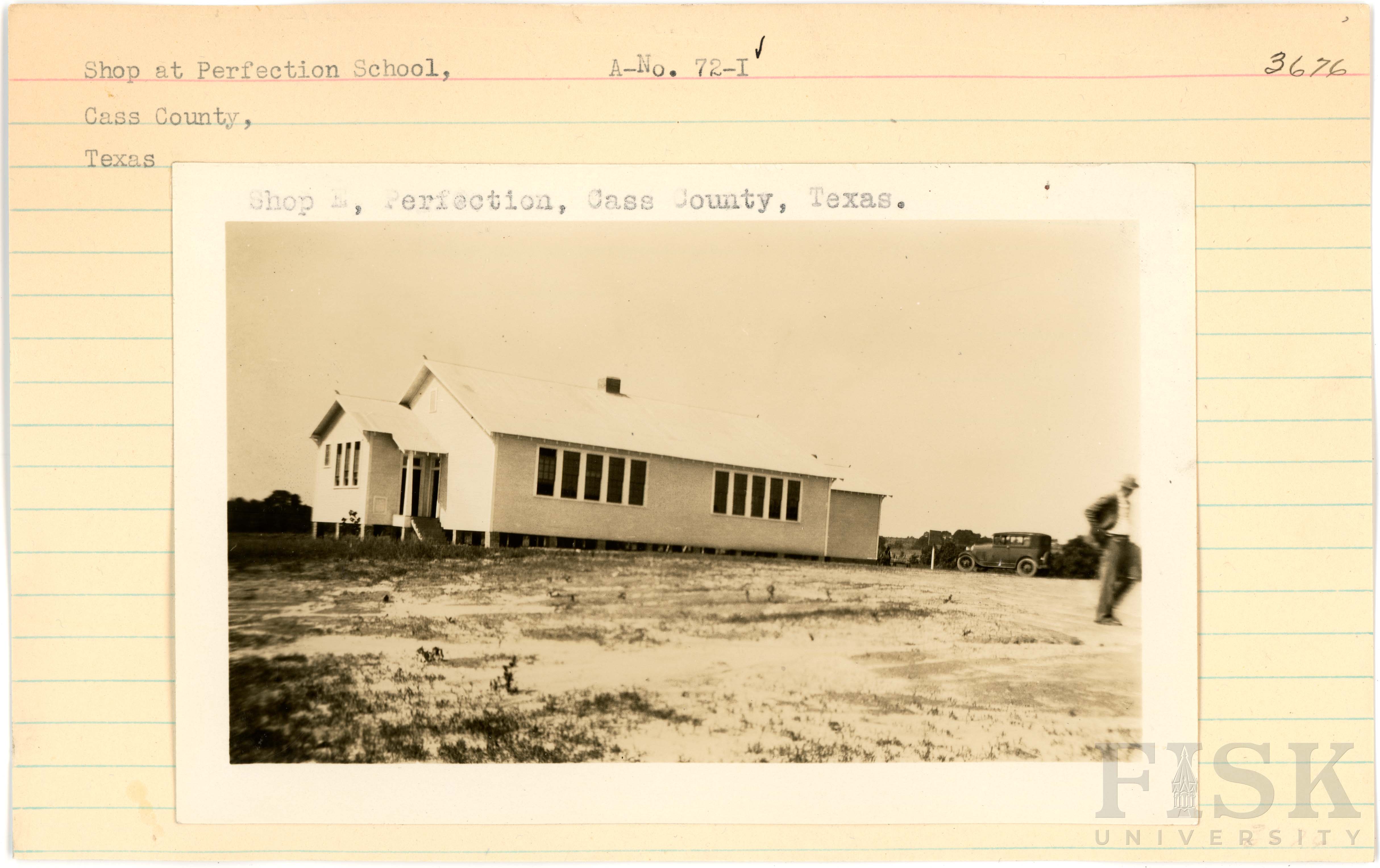 - Photos of the shop at Perfection School in Cass County, Texas with inscriptions that say, "Shop E, Perfection, Cass County, Texas"