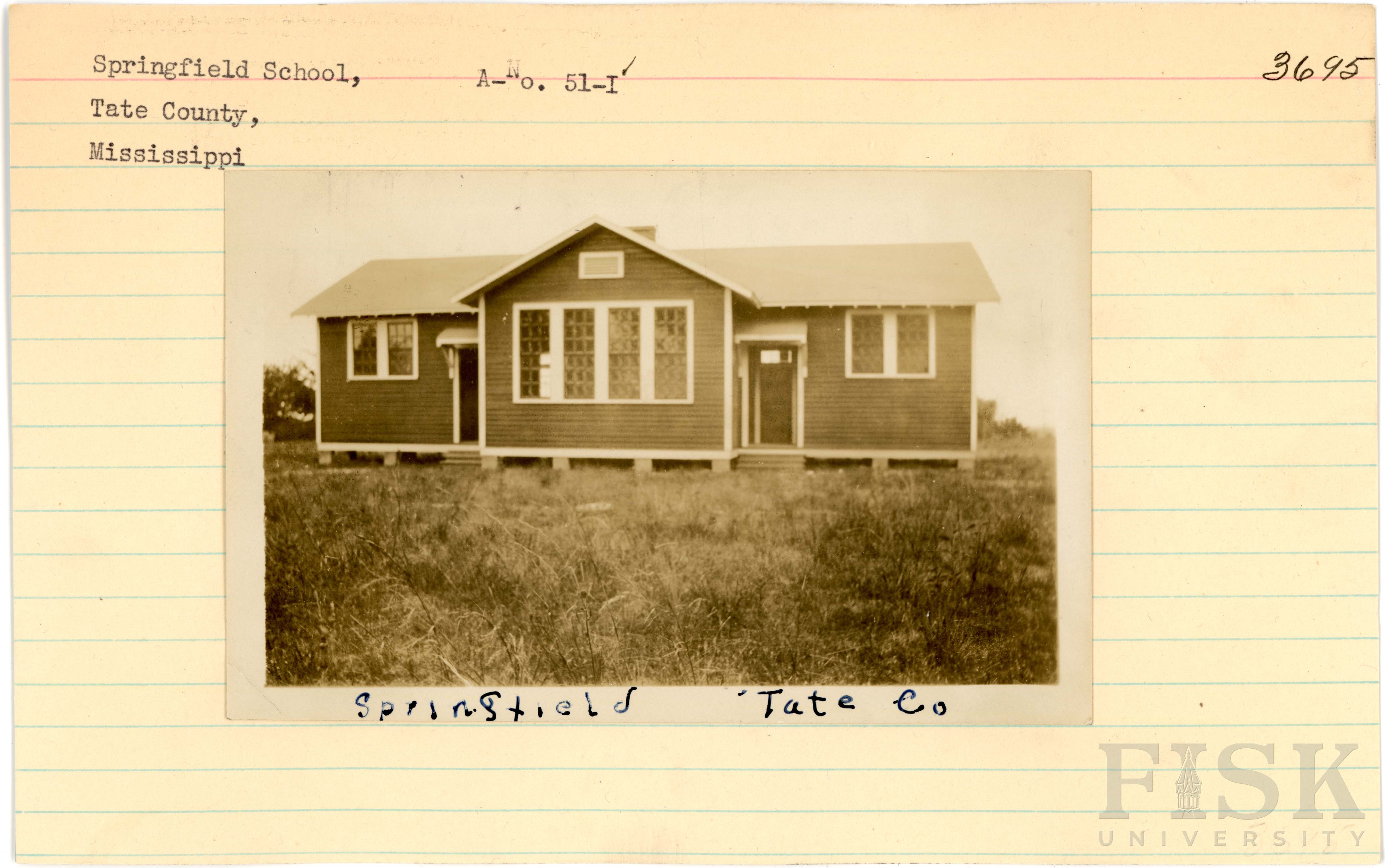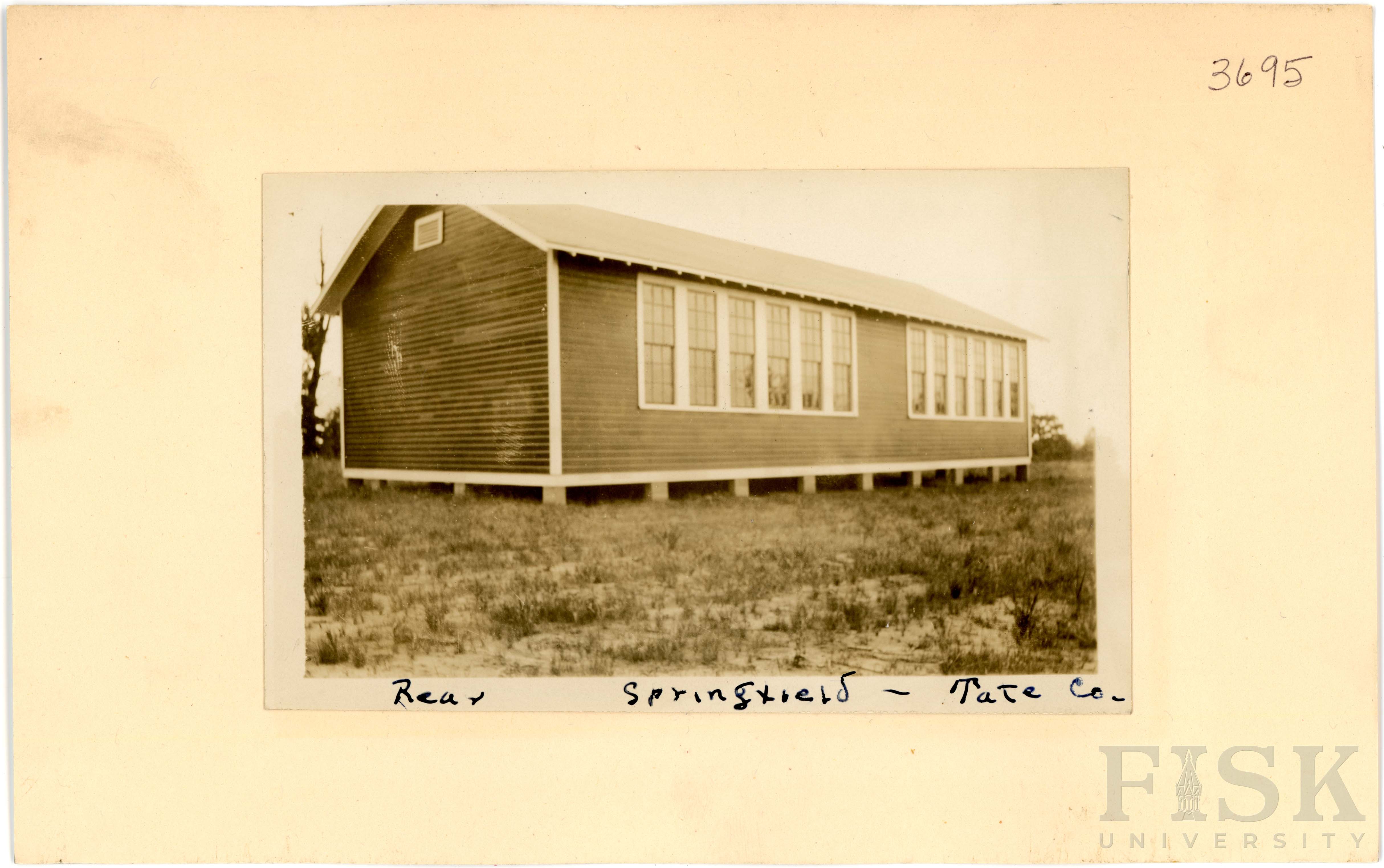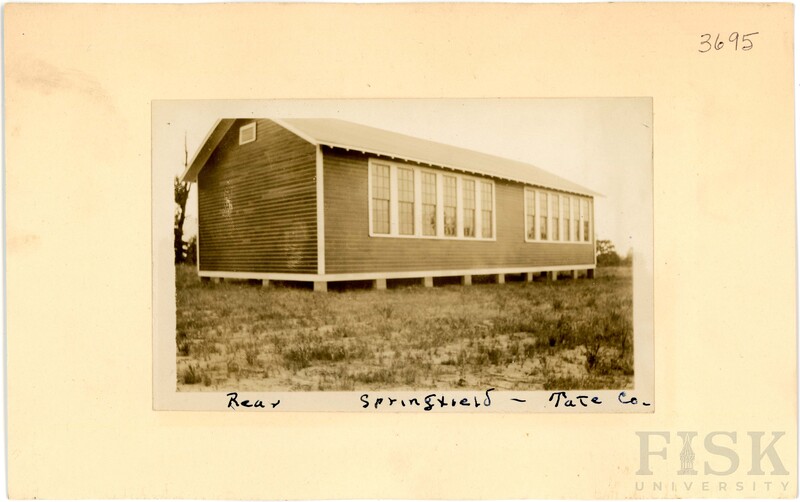 - Photo of Springfield School in Tate County, Mississippi on the front of the school card with an inscription that says, "Springfield, Tate Co"; photo of Springfield School in Tate County, Mississippi on the back of the card with an inscription that says, "Rear - Springfield, Tate Co"