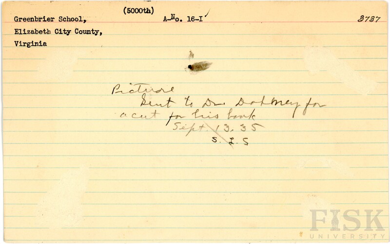 - School photo card for Greenbrier School in Elizabeth City County, Virginia with no photo attached and notes on the card that say, "(5000th)" and "Picture sent to Dr. [unclear] for a cut for his book Sept. 13, 35, S. L. S."