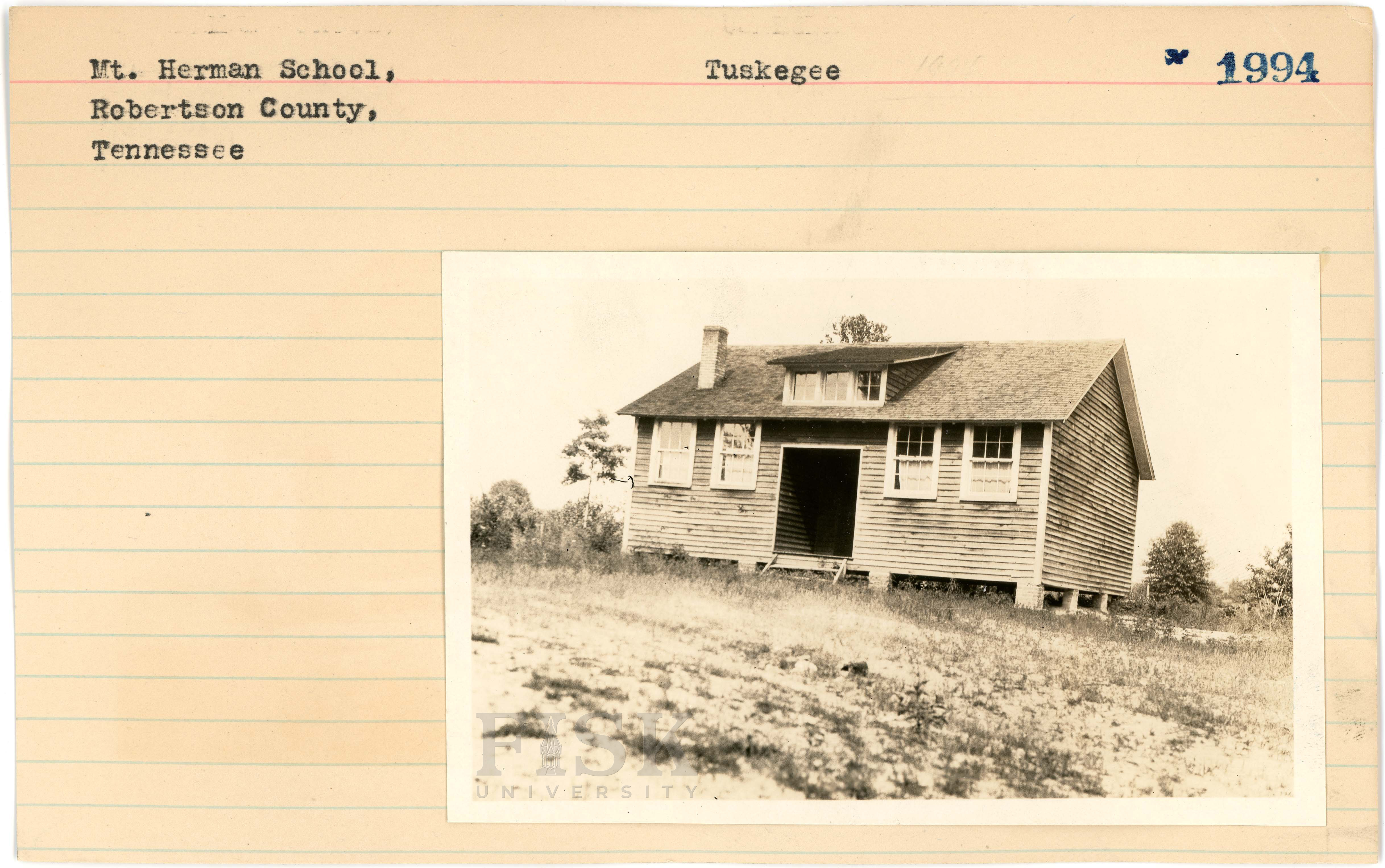 - Photos of Mt. Herman School in Robertson County, Tennessee with a note on the front of the school card that says, "Tuskegee"