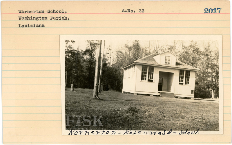 - Photo of Warnerton School in Washington Parish, Louisiana with an inscription that says, "Warnerton-Rosenwald-School"