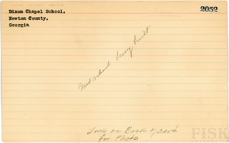 - School card for Dixon Chapel School in Newton County, Georgia with no photo attached and notes on the front that say, "New school being built" and "Look on back of card for photo"; photo of Dixon Chapel School in Newton County, Georgia on the back