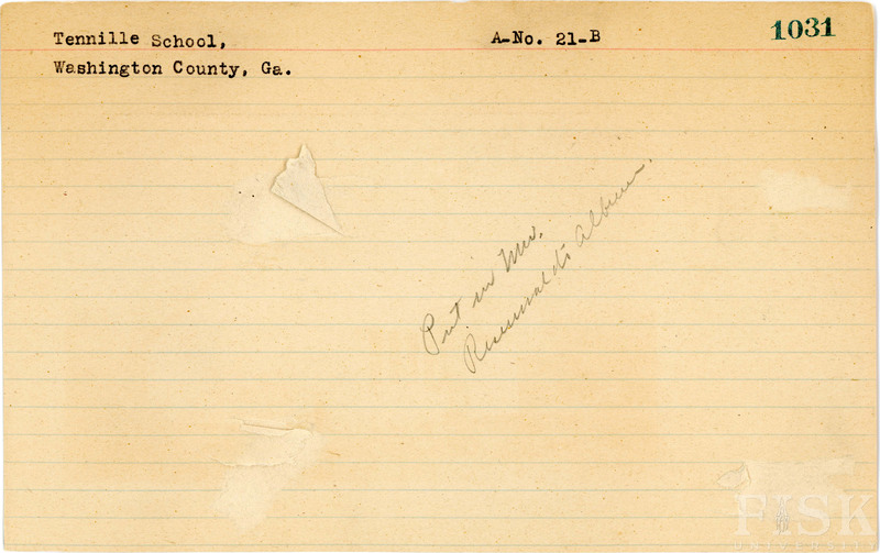 School card for Tennille School in Washington County, Georgia with no photo attached and a note that says, "Put in Mr. Rosenwald's album"