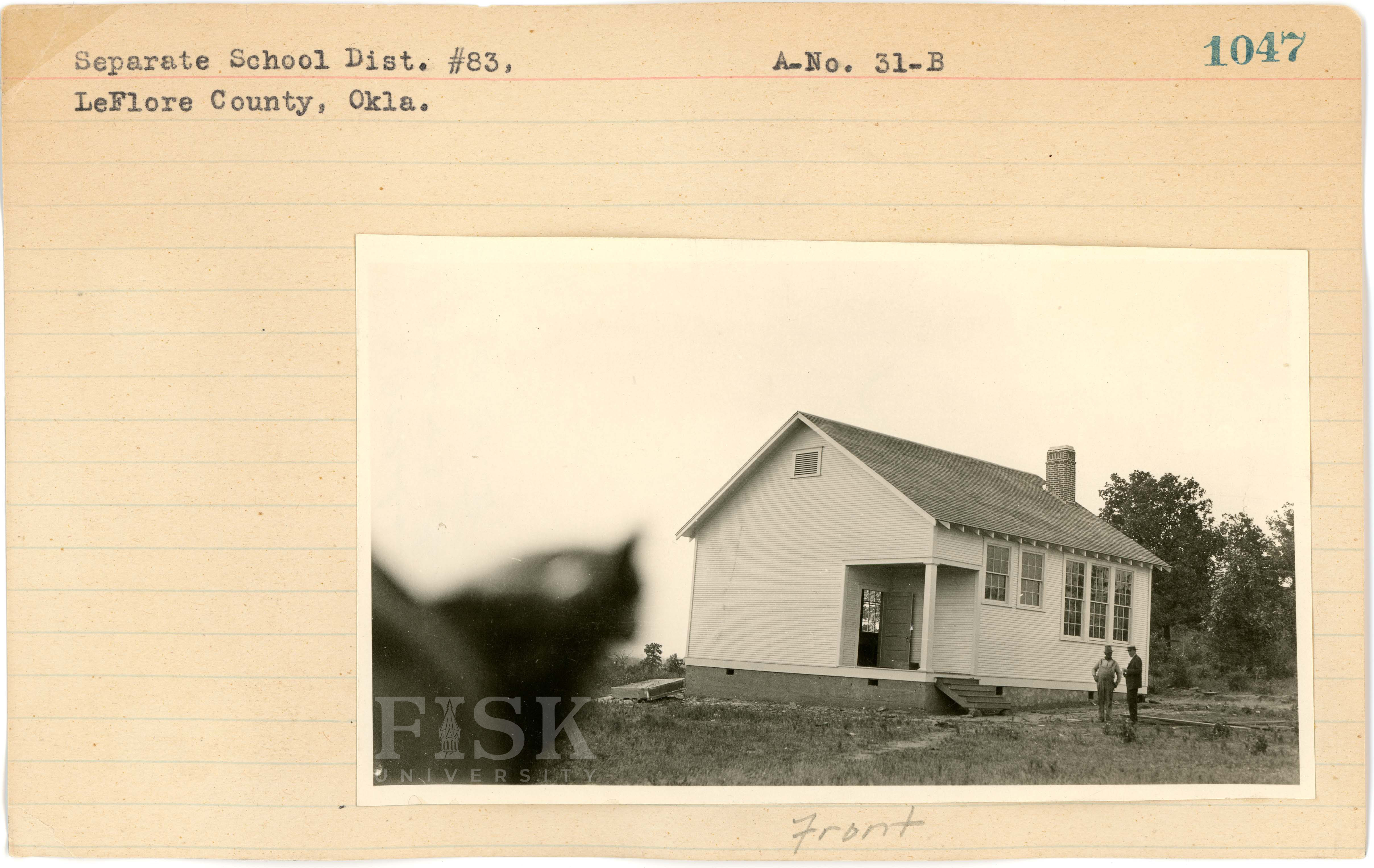 - Photos of Separate School, District No. 38 in Le Flore County, Oklahoma with a note on the front of the school card that says, "Front" and a note on the back that says, "Back"