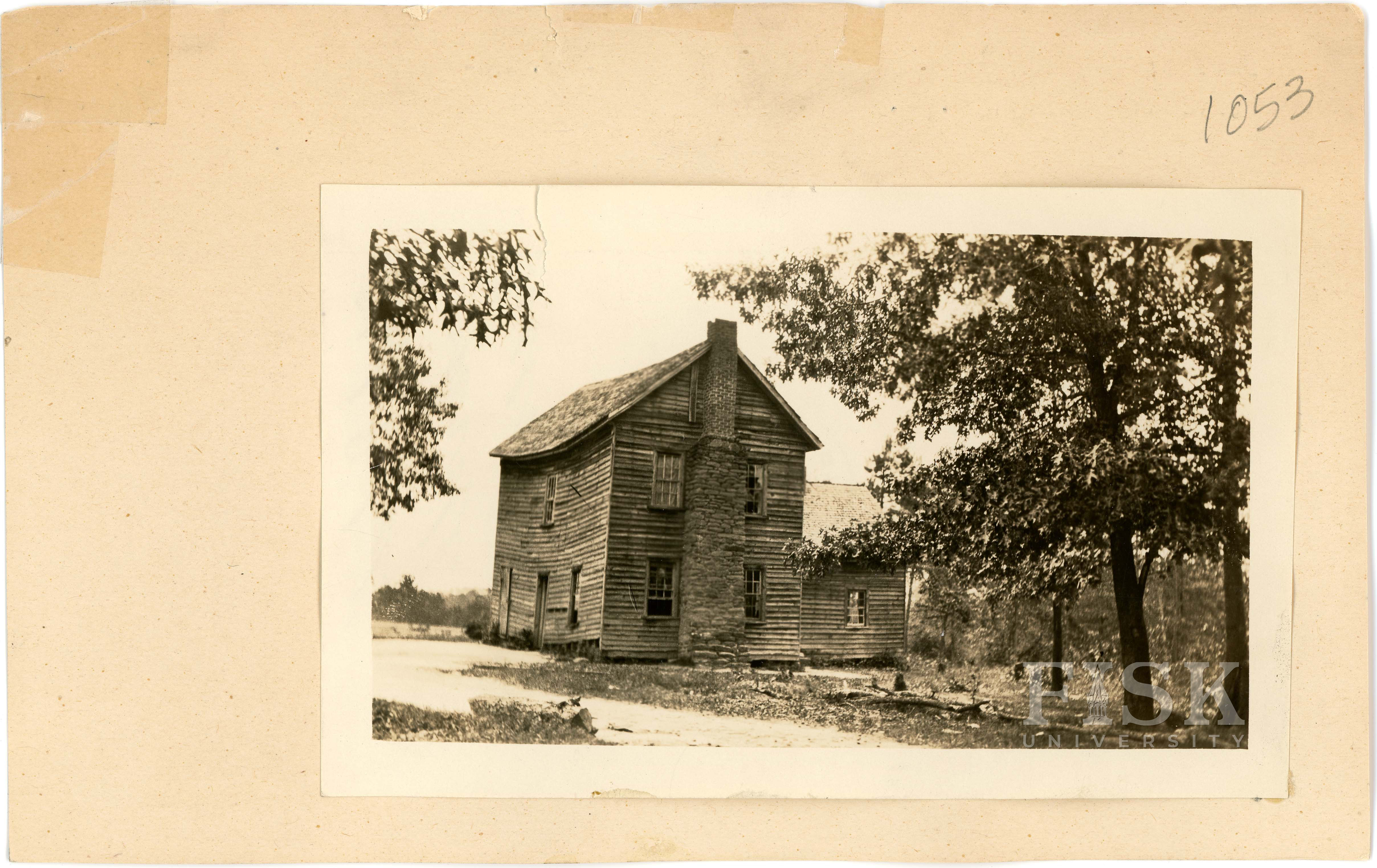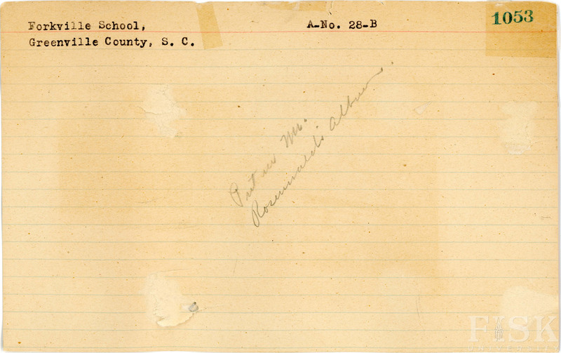 - School card for Forkville School in Greenville County, South Carolina with no photo attached and a note on the front that says, "Put in Mr. Rosenwald's album"; photo of Forkville School in Greenville County, South Carolina on the back