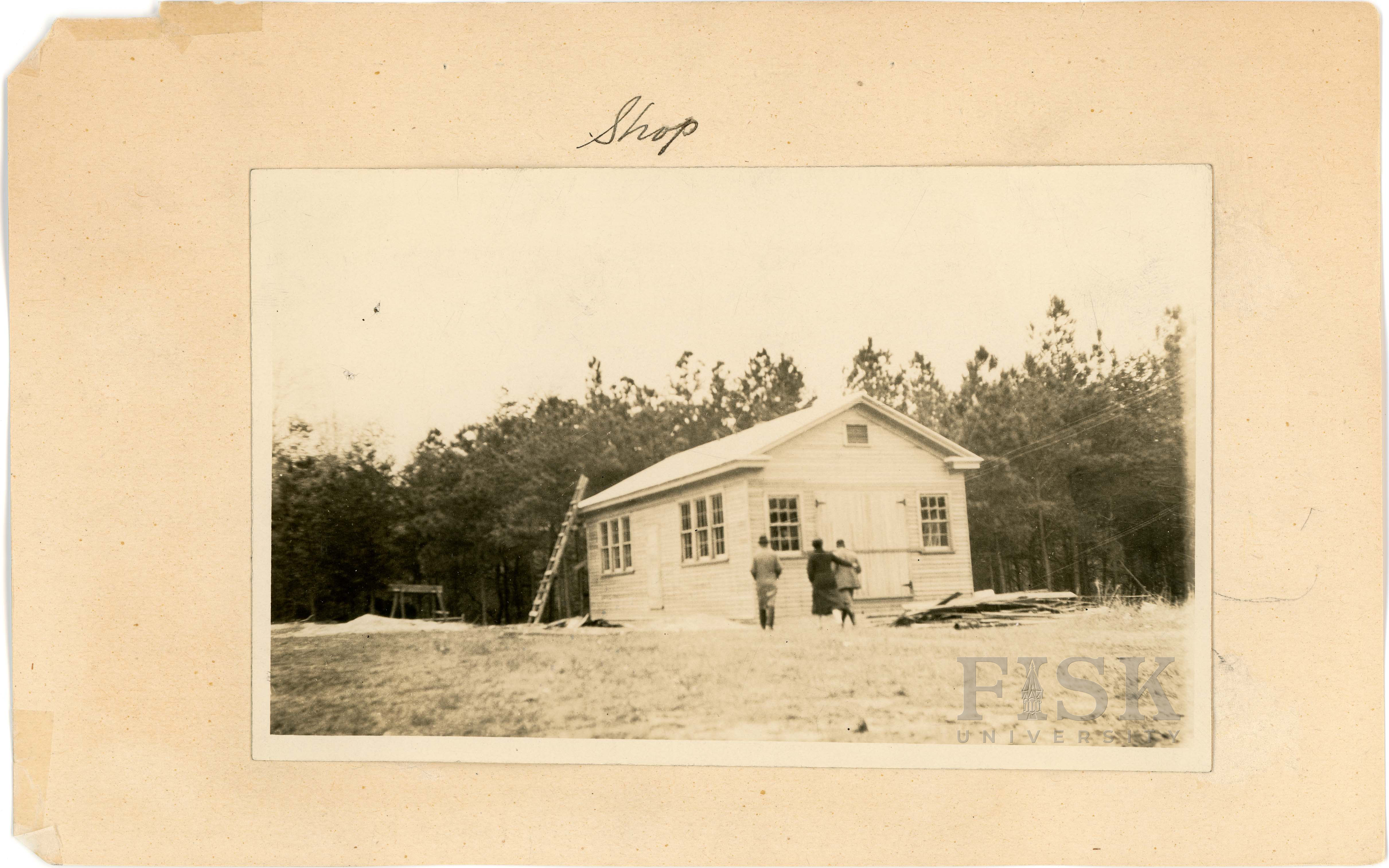Photo of County Training School in King William County, Virginia with notes on the front of the school card that say, "School" and "Shop (See back of card)"; photo of the shop at County Training School in King William County, Virginia on the back with a note that says, "Shop"