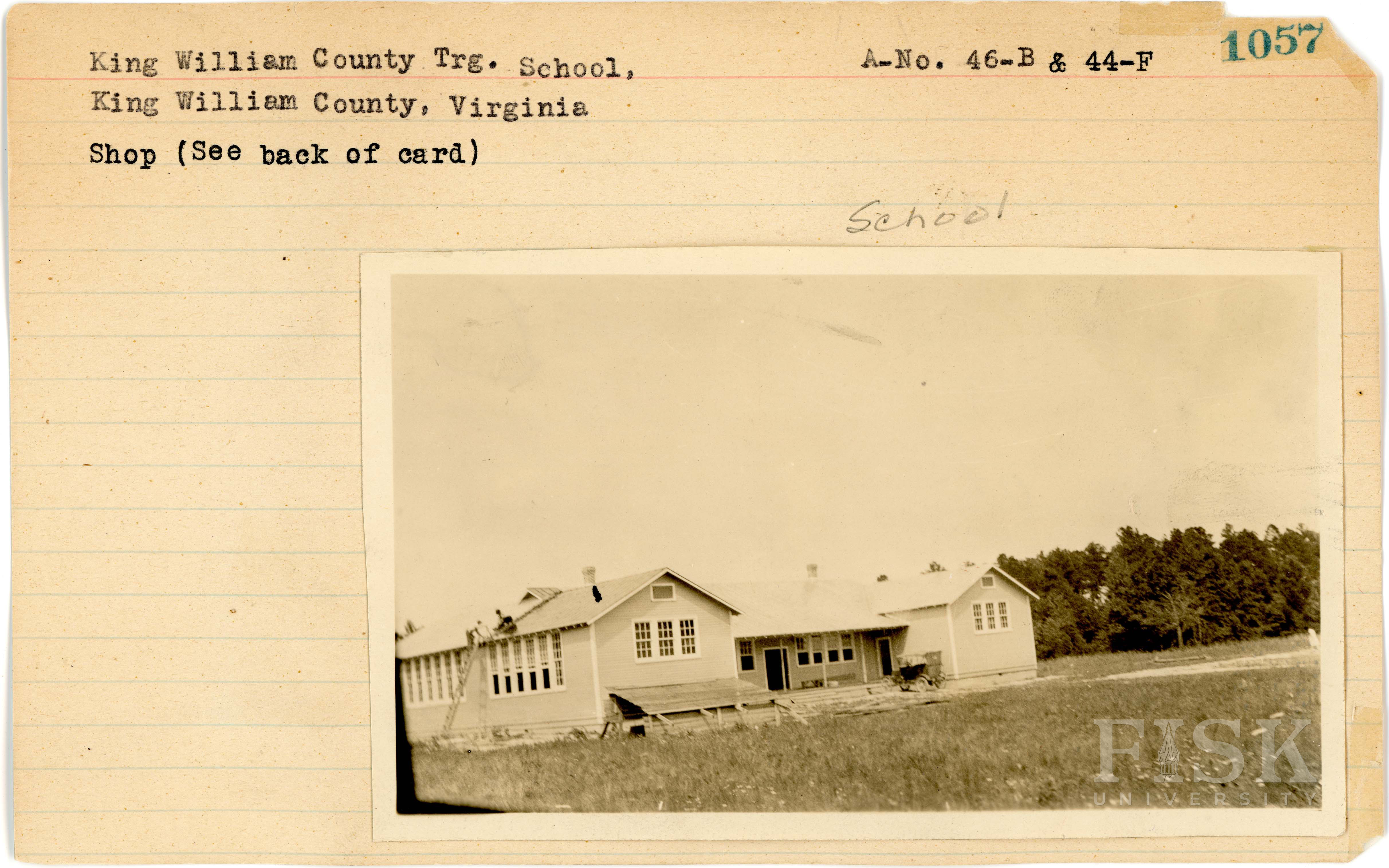 - Photo of County Training School in King William County, Virginia with notes on the front of the school card that say, "School" and "Shop (See back of card)"; photo of the shop at County Training School in King William County, Virginia on the back with a note that says, "Shop"