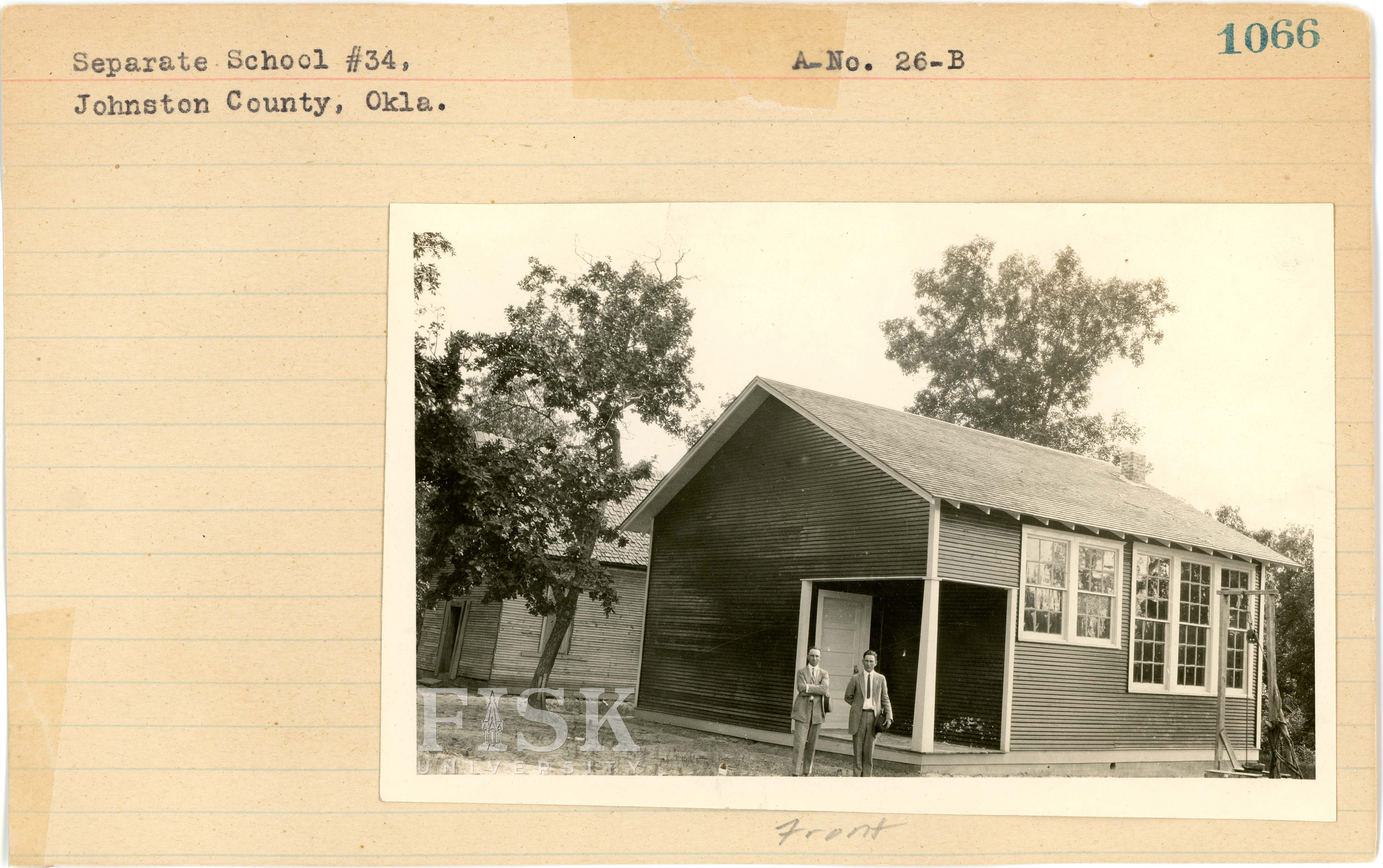 Photos of Separate School No. 34 in Johnston County, Oklahoma with a note on the front of the school card that says, "Front" and a note on the back that says, "Back"