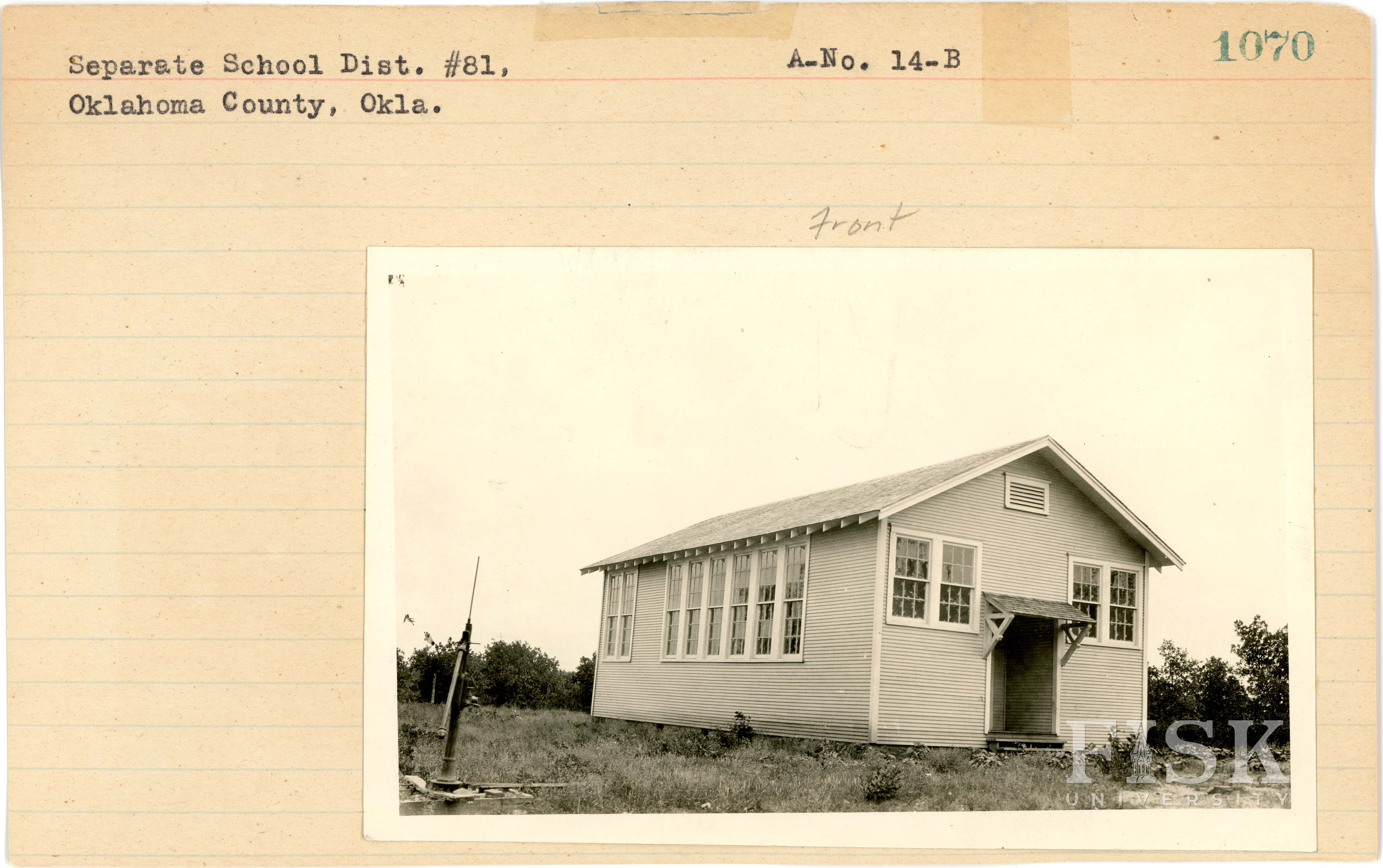 - Photos of Separate School, District No. 81 in Oklahoma County, Oklahoma with a note on the front of the school card that says, "Front" and a note on the back that says, "Back"