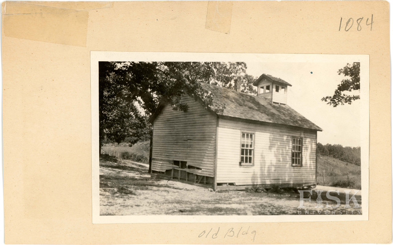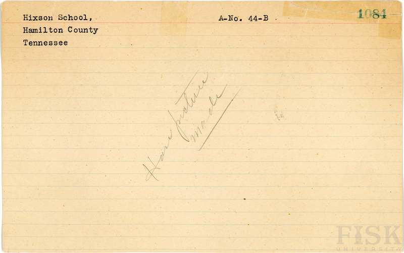 - School card for Hixson School in Hamilton County, Tennessee without a photo attached and a note on the front that says, "Have picture made"; photo of Hixson School in Hamilton County, Tennessee on the back with a note that says, "Old Bldg"