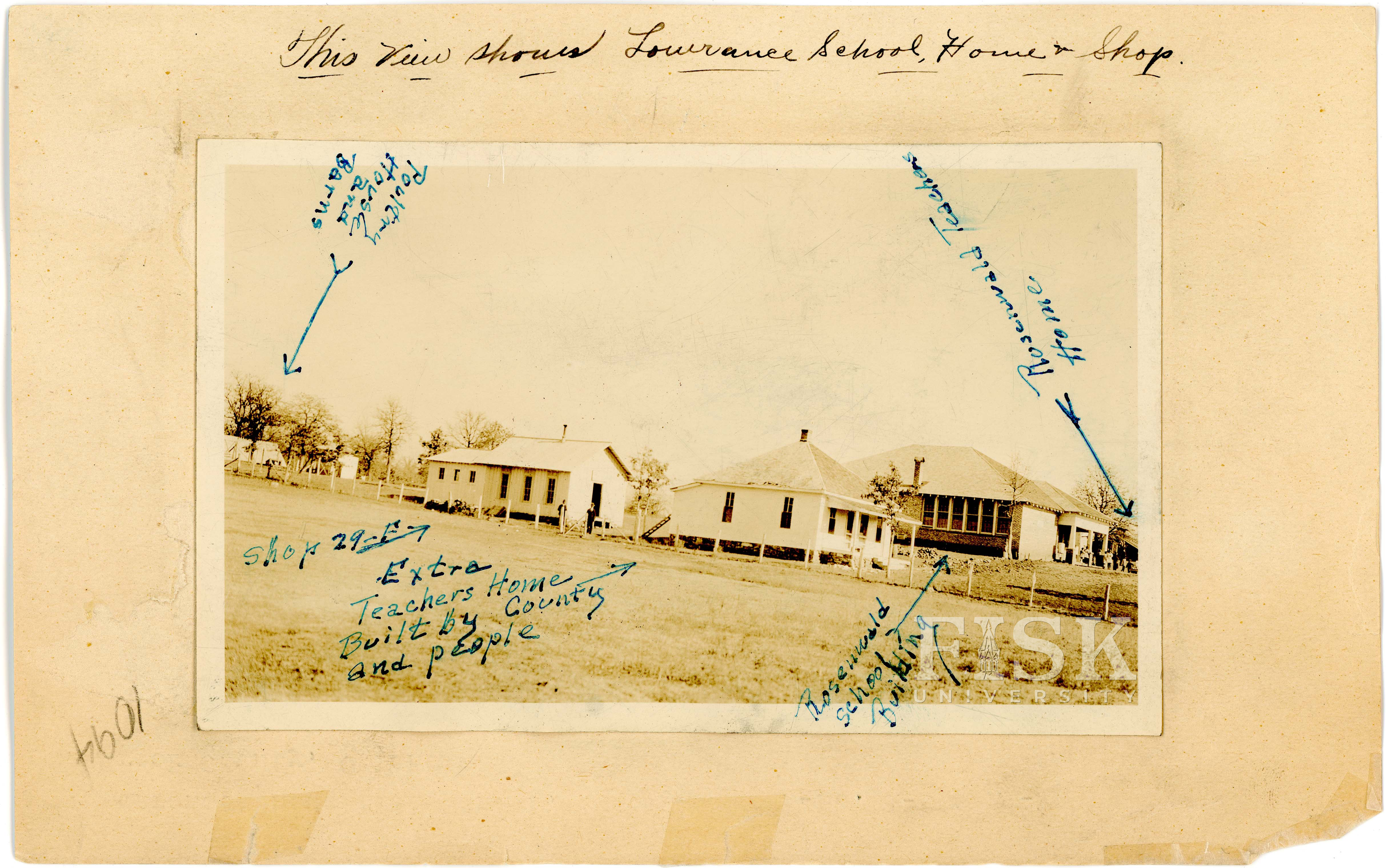 - Photos of Lowrance Industrial School and shop in Creek County, Oklahoma with notes on the back of the school card that say, "This view shows Lowrance School Home & Shop" "Poultry house and Barns" "Rosenwald Teachers Home," "Rosenwald school building" "Extra teachers home built by County and people" and "Shop 29-F"