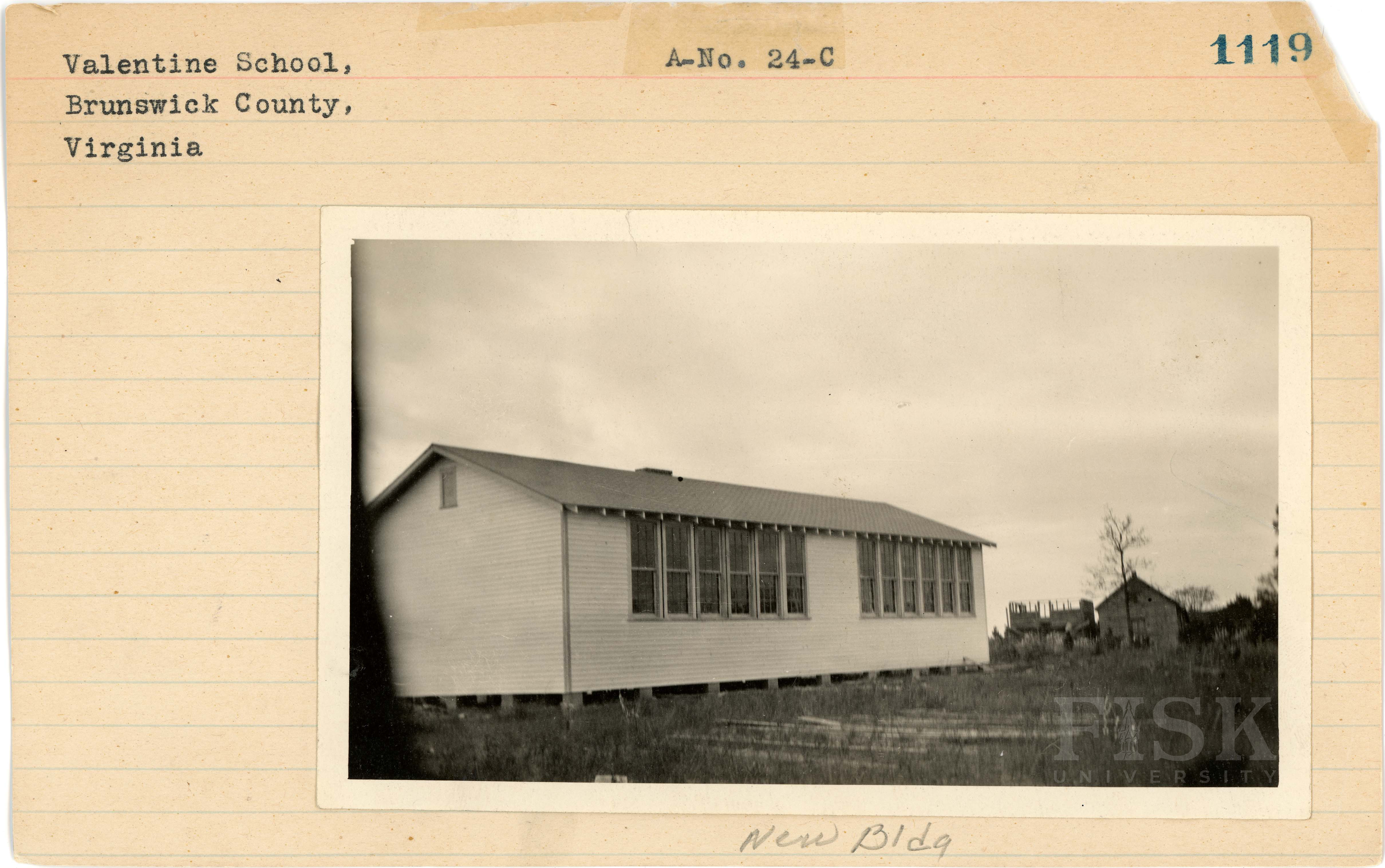 - Photos of Valentine School in Brunswick County, Virginia with a note on the front of the school card that says, "New Bldg" and a note on the back that says, "Old Bldg"
