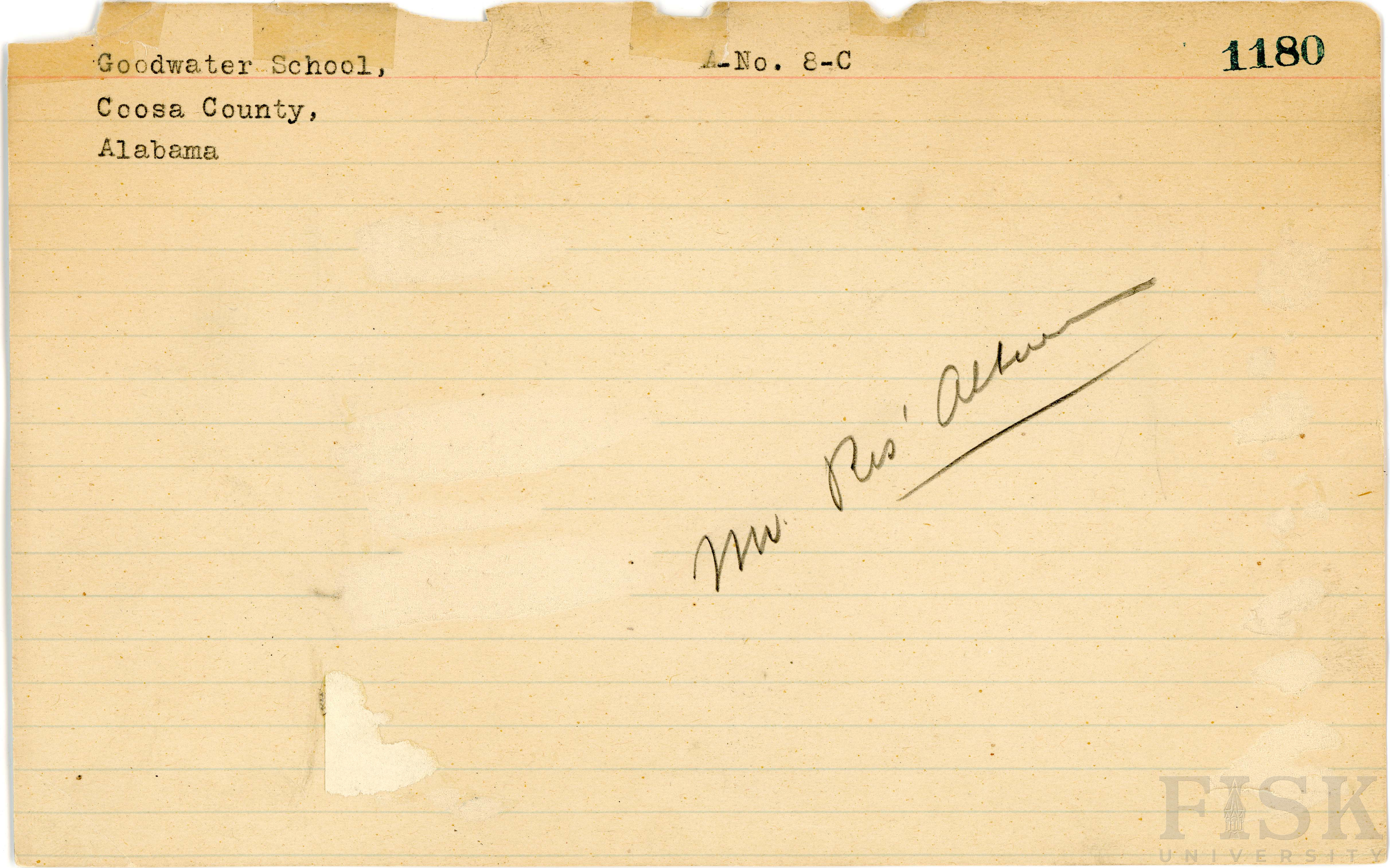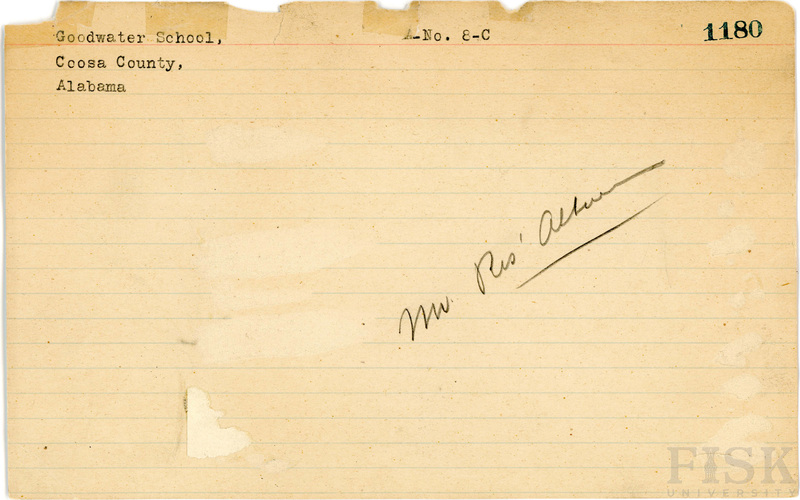 School card for Goodwater School in Coosa County, Alabama with no photo attached and a note that says, "Mr. R's album"