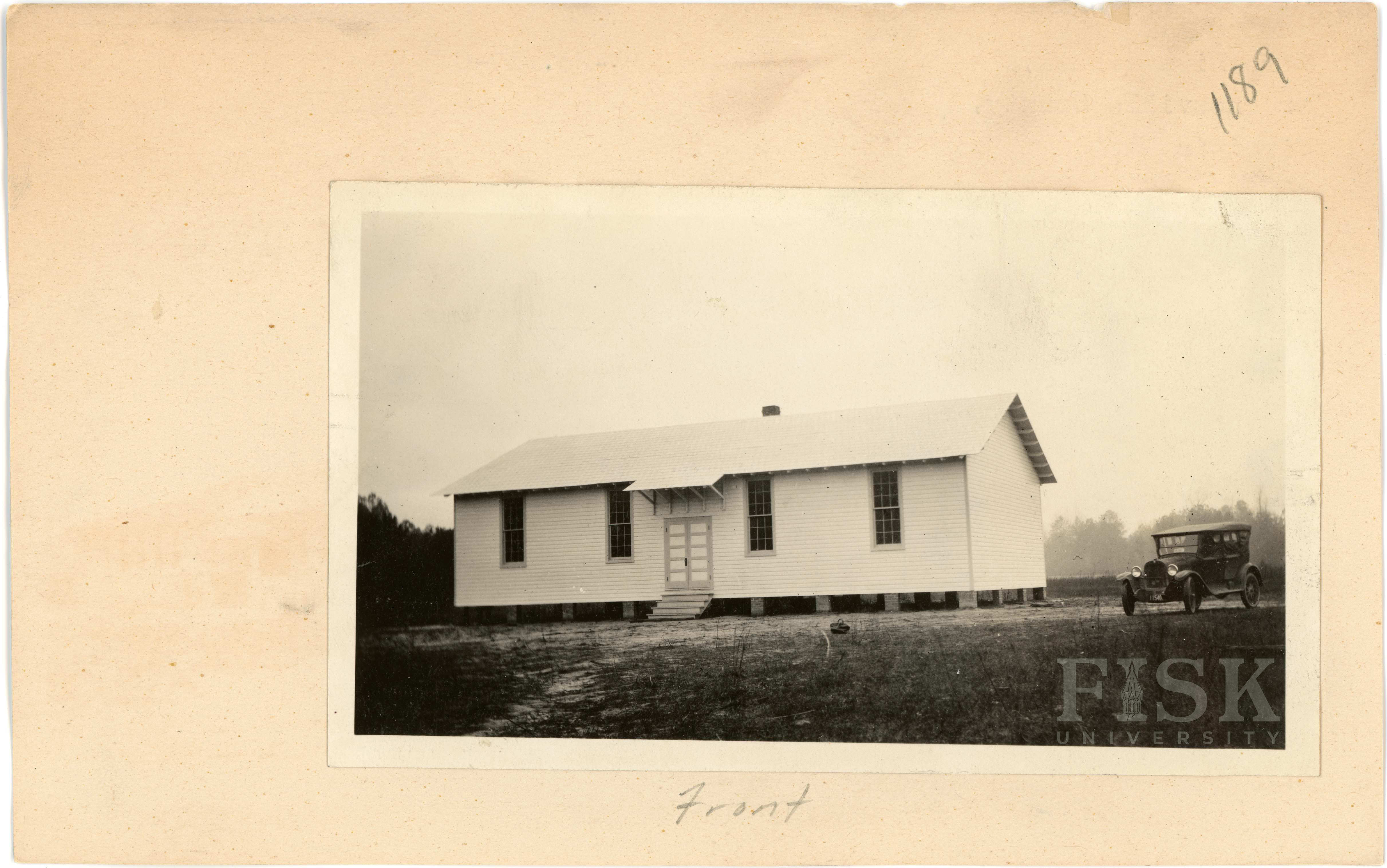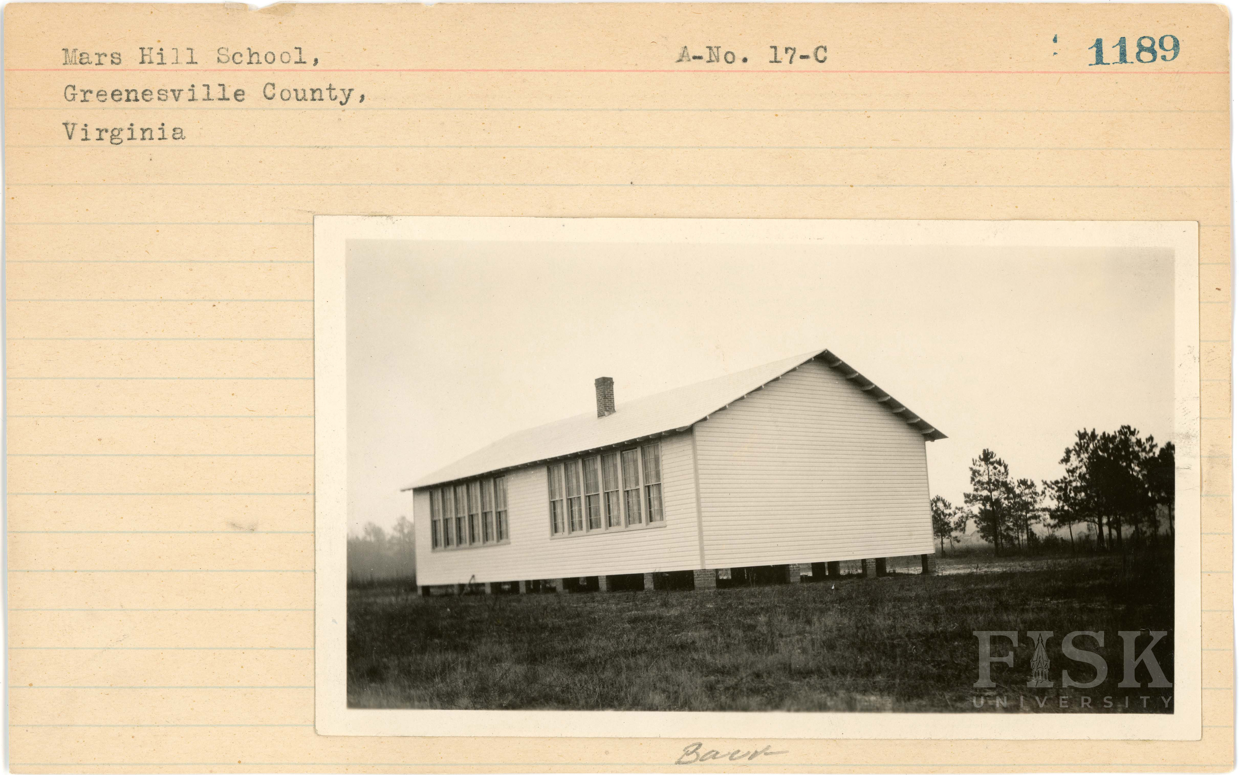 - Photos of Mars Hill School in Greenesville County, Virginia with a note on the front of the school card that says, "Back" and a note on the back that says, "Front"