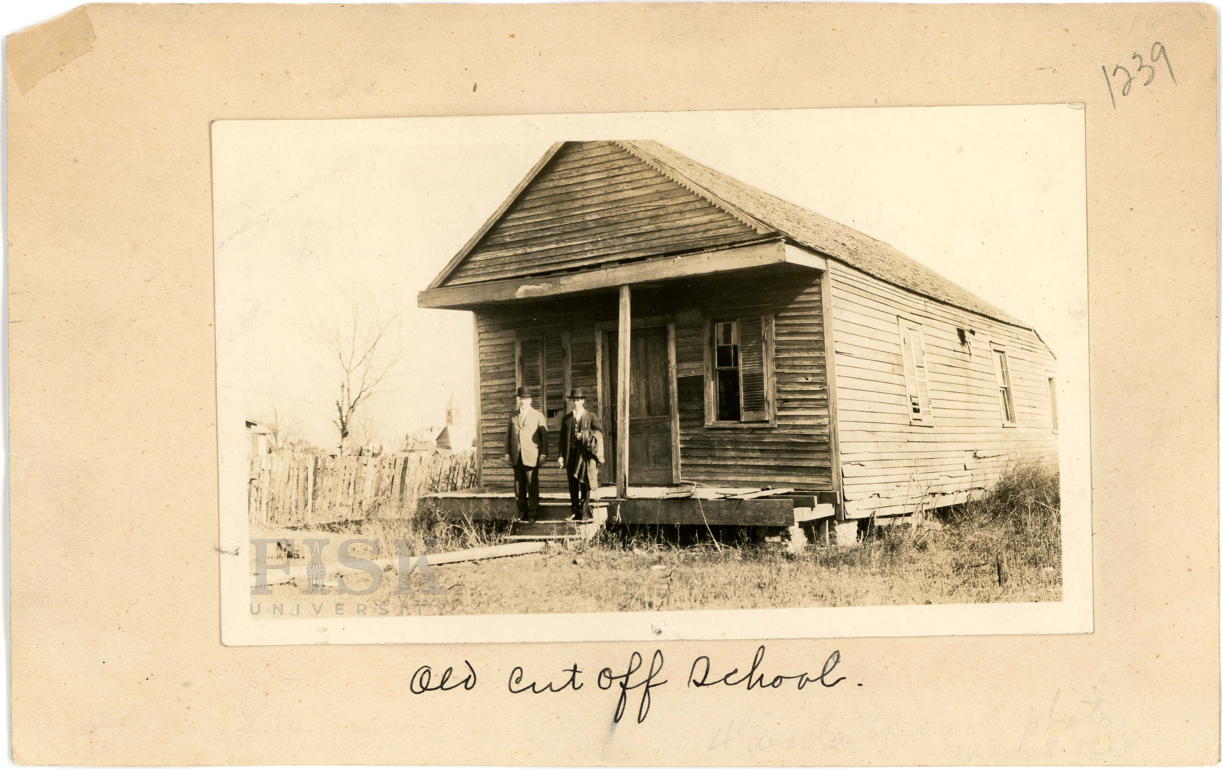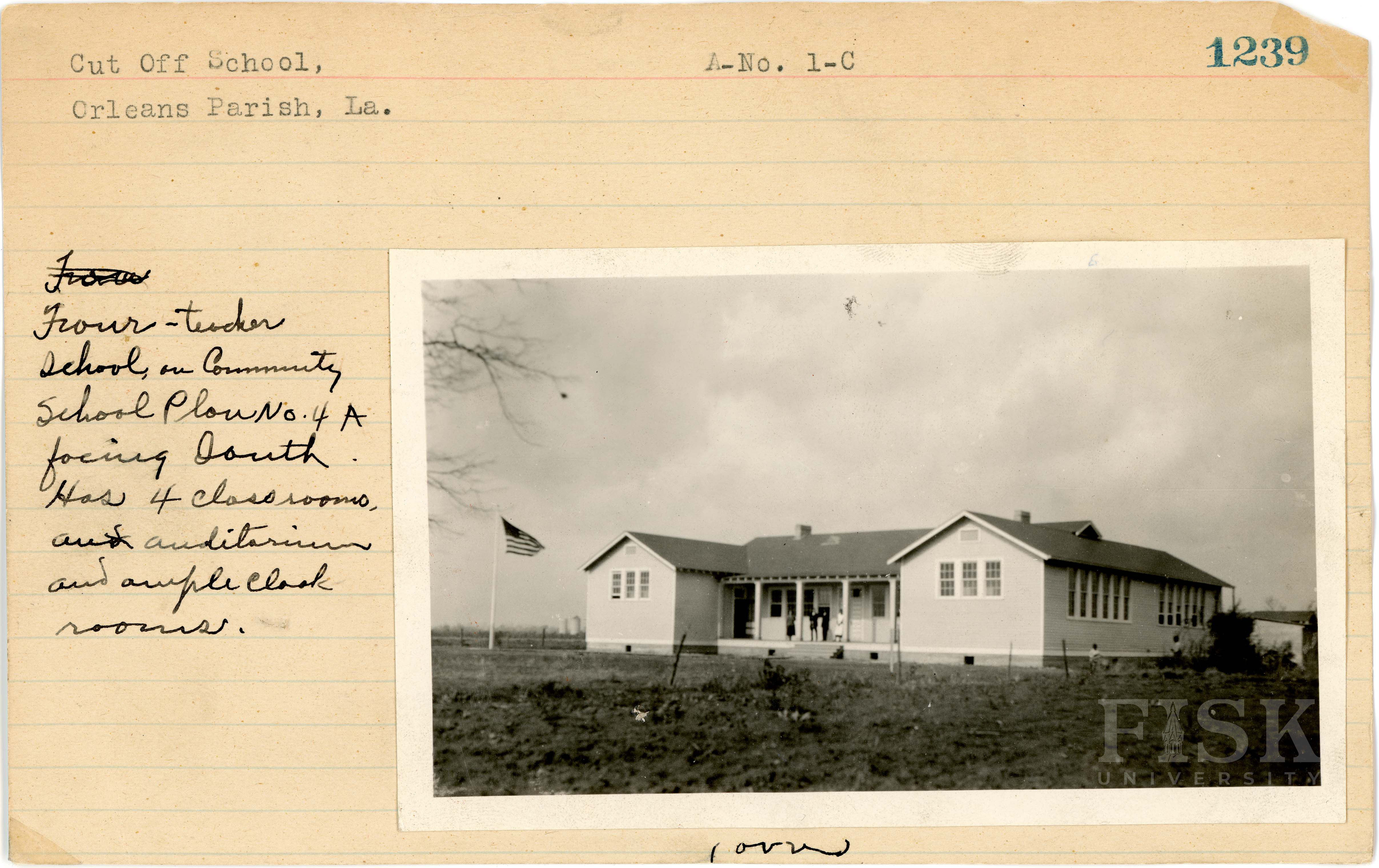 - Photos of Cut Off School in Orleans Parish, Louisiana with notes on the front of the school card that say, "four-teacher school in community school plan no. 4A facing south. Has 4 classrooms and auditorium and ample cloak rooms" and "round", and a note on the back that says, "Old cut off school"