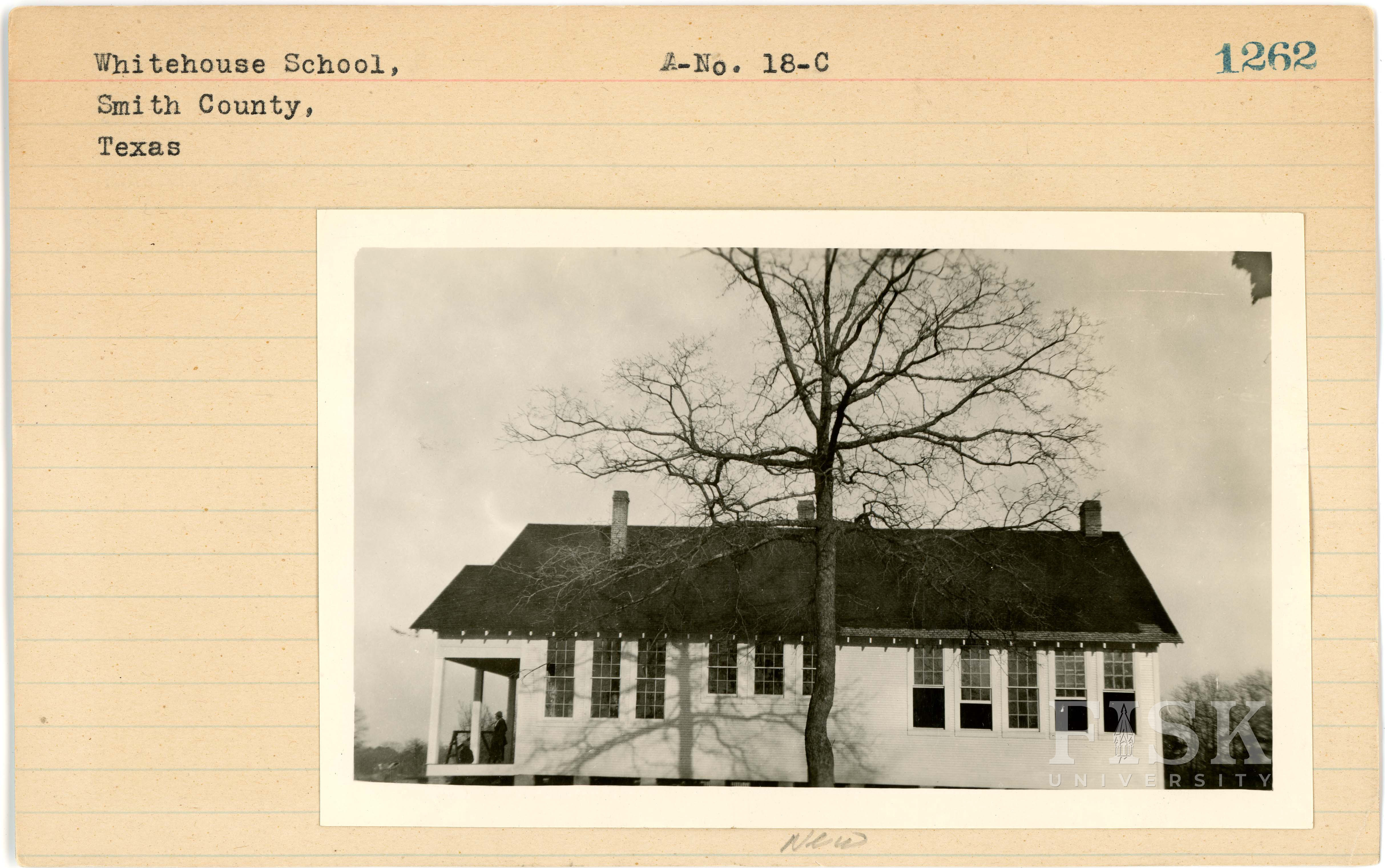 Photos of Whitehouse School in Smith County, Texas with a note on the front of the school card that says, "New" and a note on the back that says, "Old"