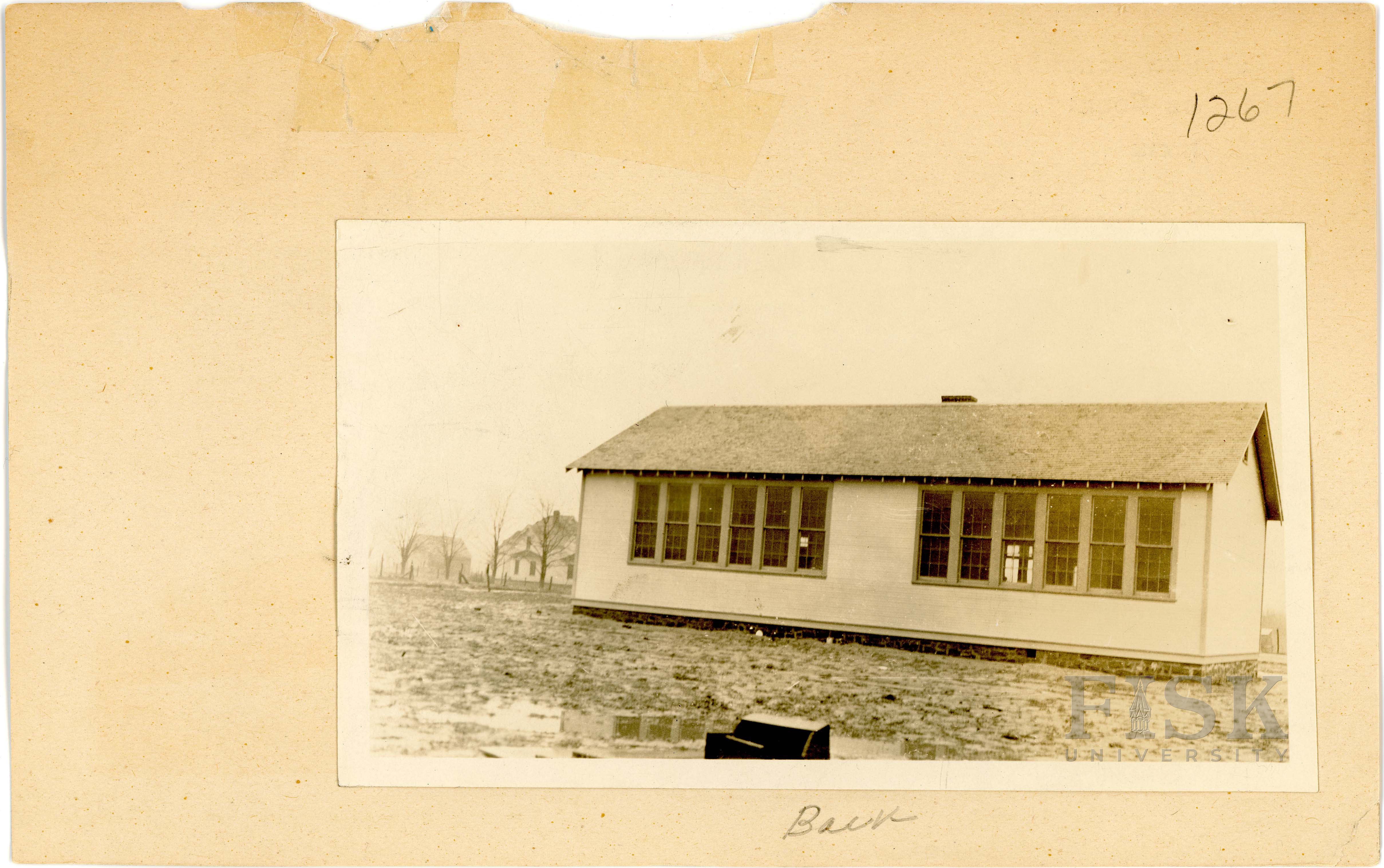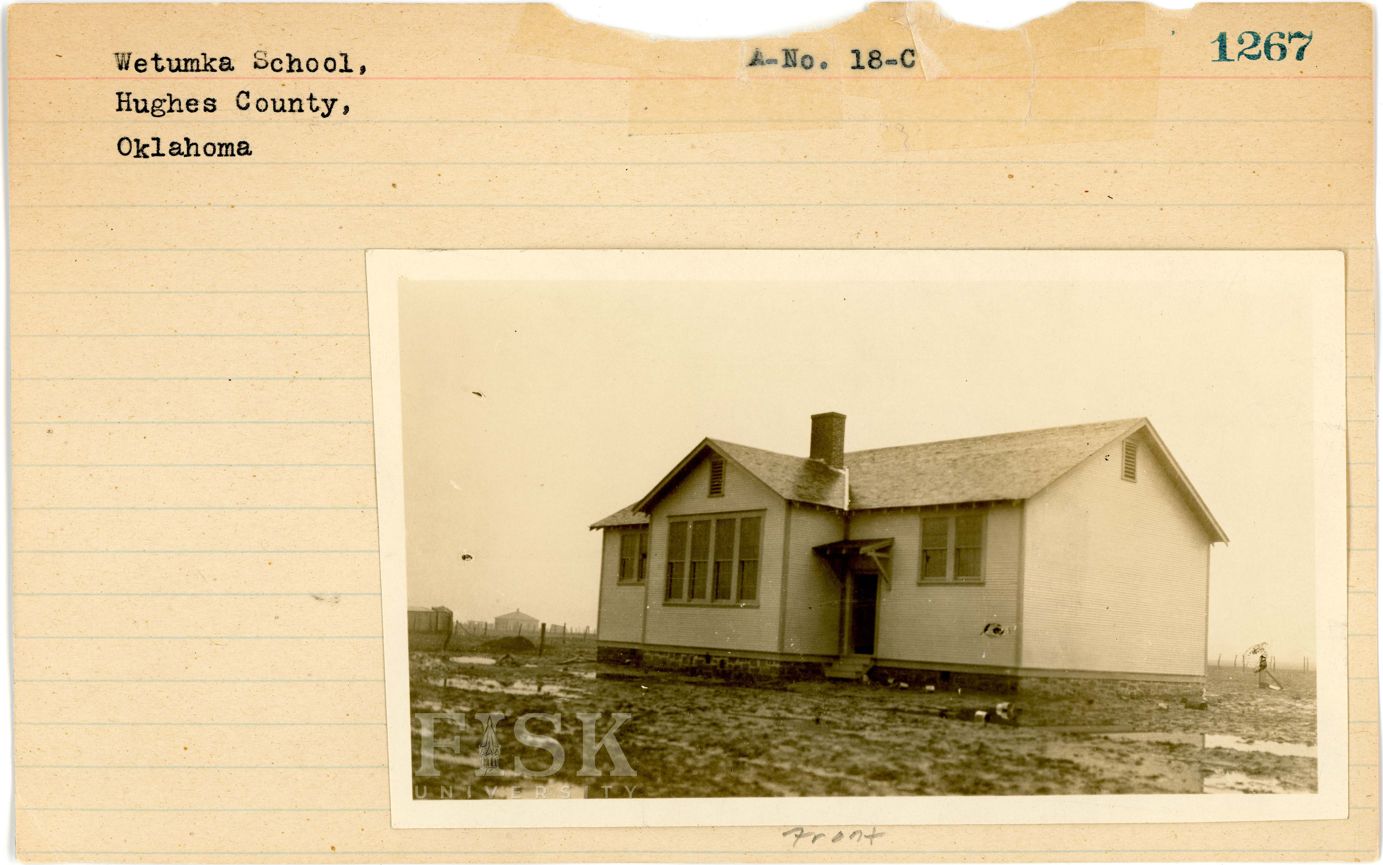 - Photos of Wetumka School in Hughes County, Oklahoma with a note on the front of the school card that says, "Front" and a note on the back that says, "Back"