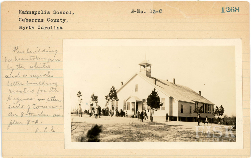- Photo of students at Kannapolis School in Cabarrus County, North Carolina with a note on the school card that says, "This building has been taken over by the whites and a much better building erected for the Negroes on other side of town-an 8-teacher on plan 8-A. S.L.S."