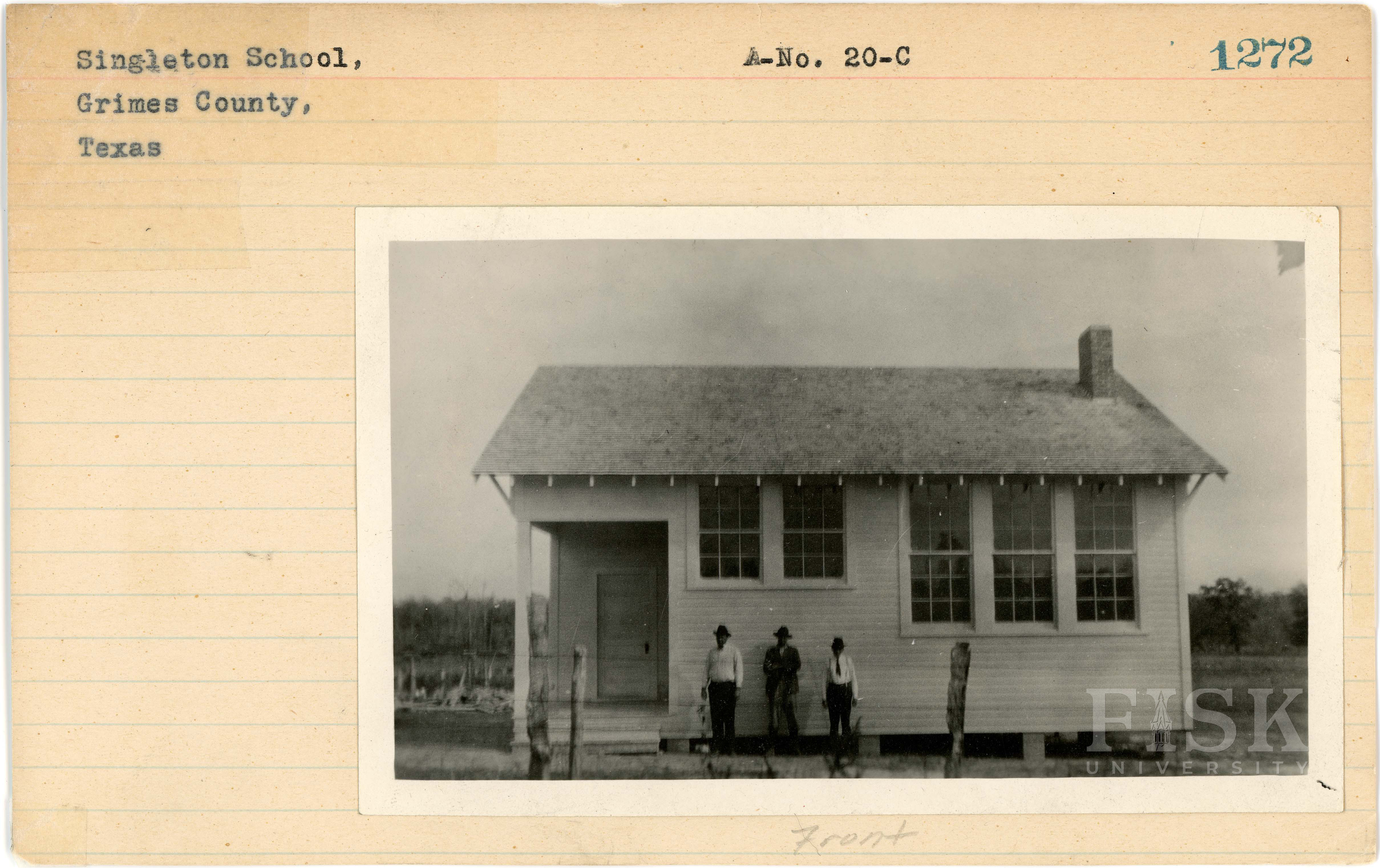 - Photos of Singleton School in Grimes County, Texas with a note on the front of the school card that says, "Front" and a note on the back that says, "Back"