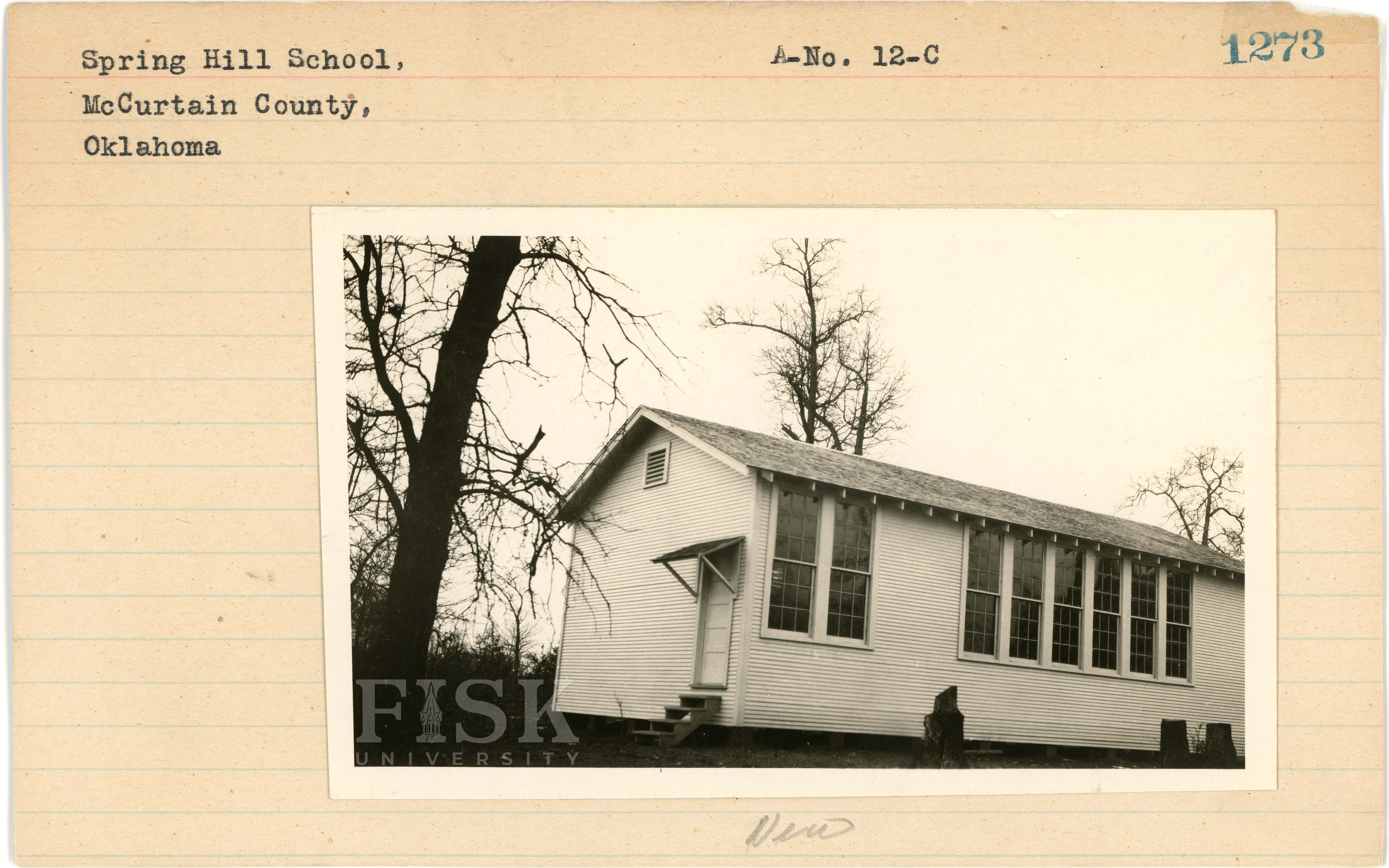 - Photos of Spring Hill School in McCurtain County, Oklahoma with a note on the front of the school card that says, "New" and a note on the back that says, "Old"