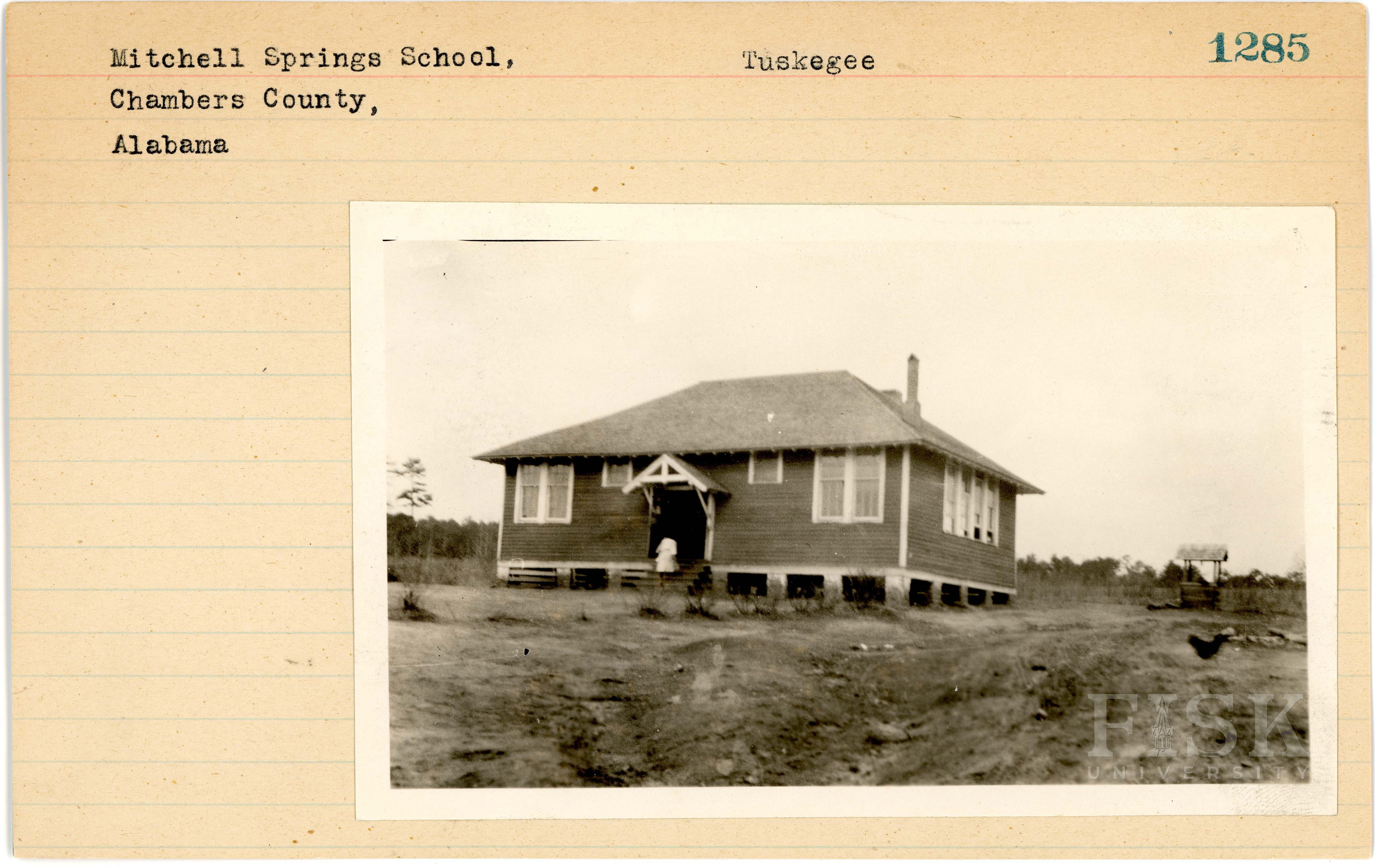 - Photos of Mitchell Springs School in Chambers County, Alabama with a note on the front of the school card that says, "Tuskegee"
