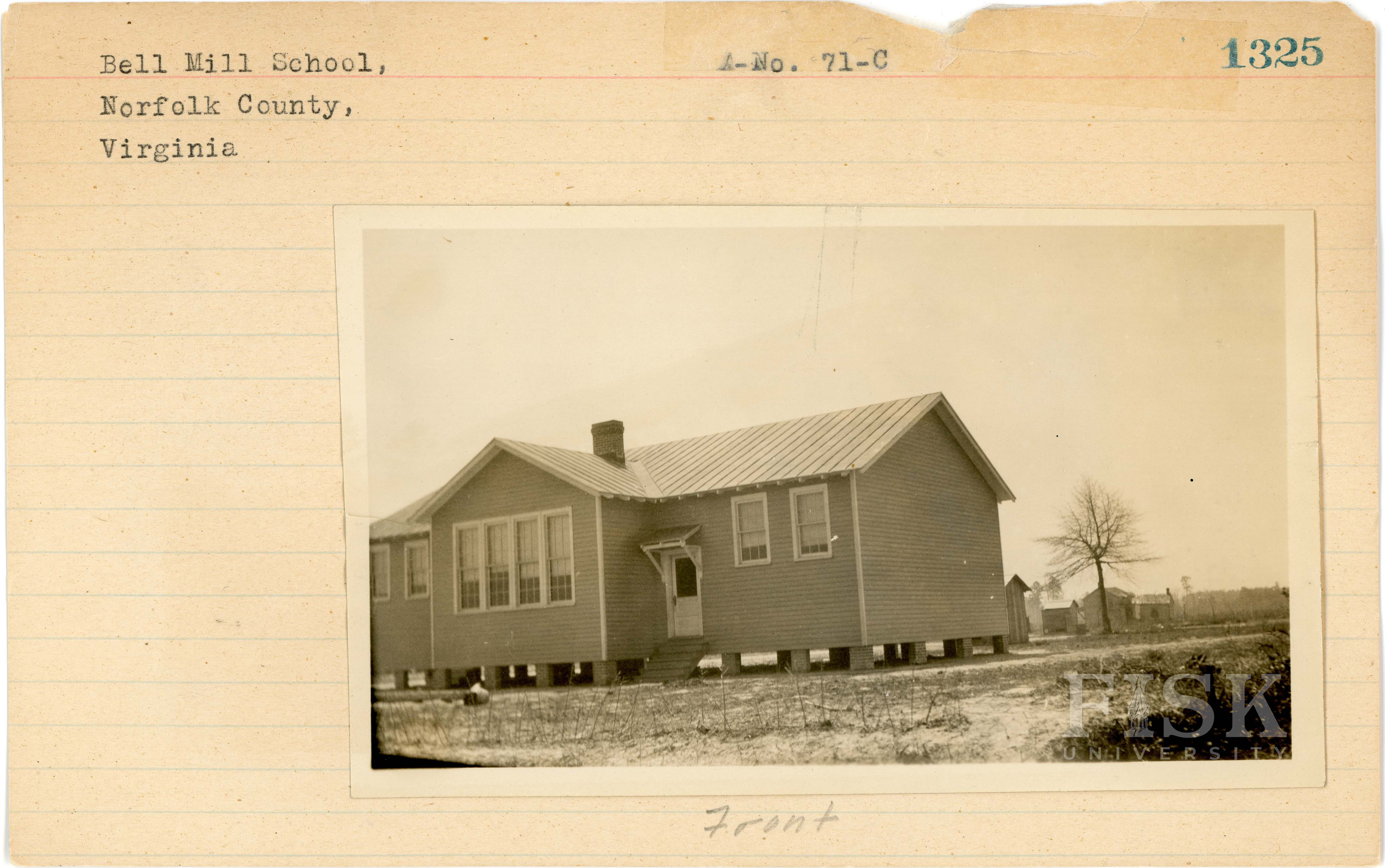 - Photos of Bell Mill School in Norfolk County, Virginia with a note on the front of the school card that says, "Front" and a note on the back that says, "Back"