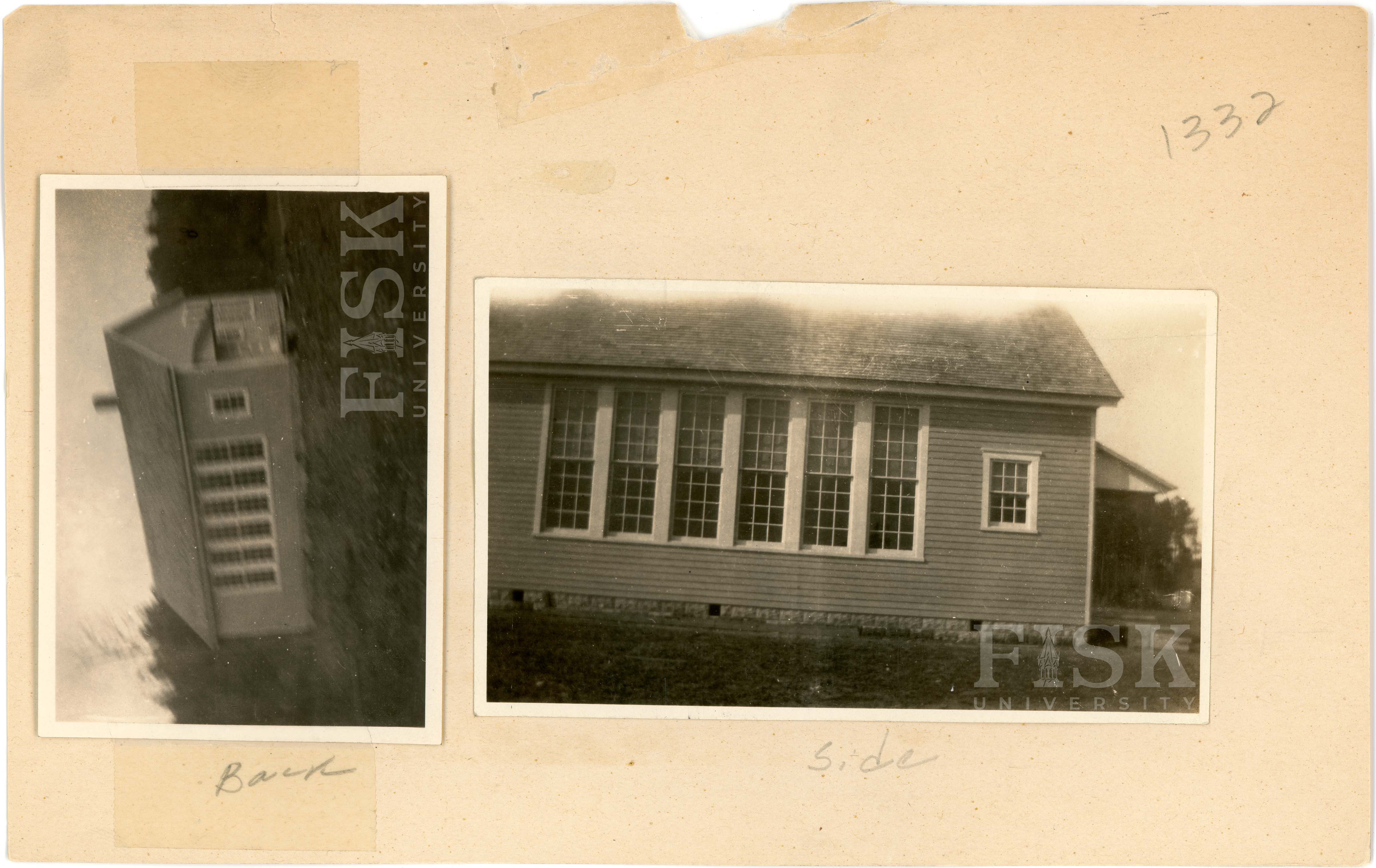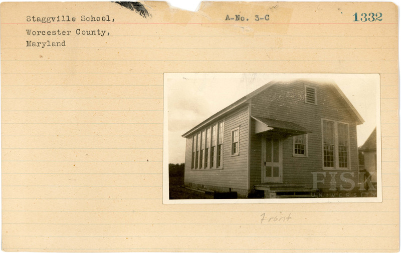 - Photos of Staggville School in Worcester County, Maryland with a note on the front of the school card that says, "Front" and notes on the back that say, "Back" and "Side"