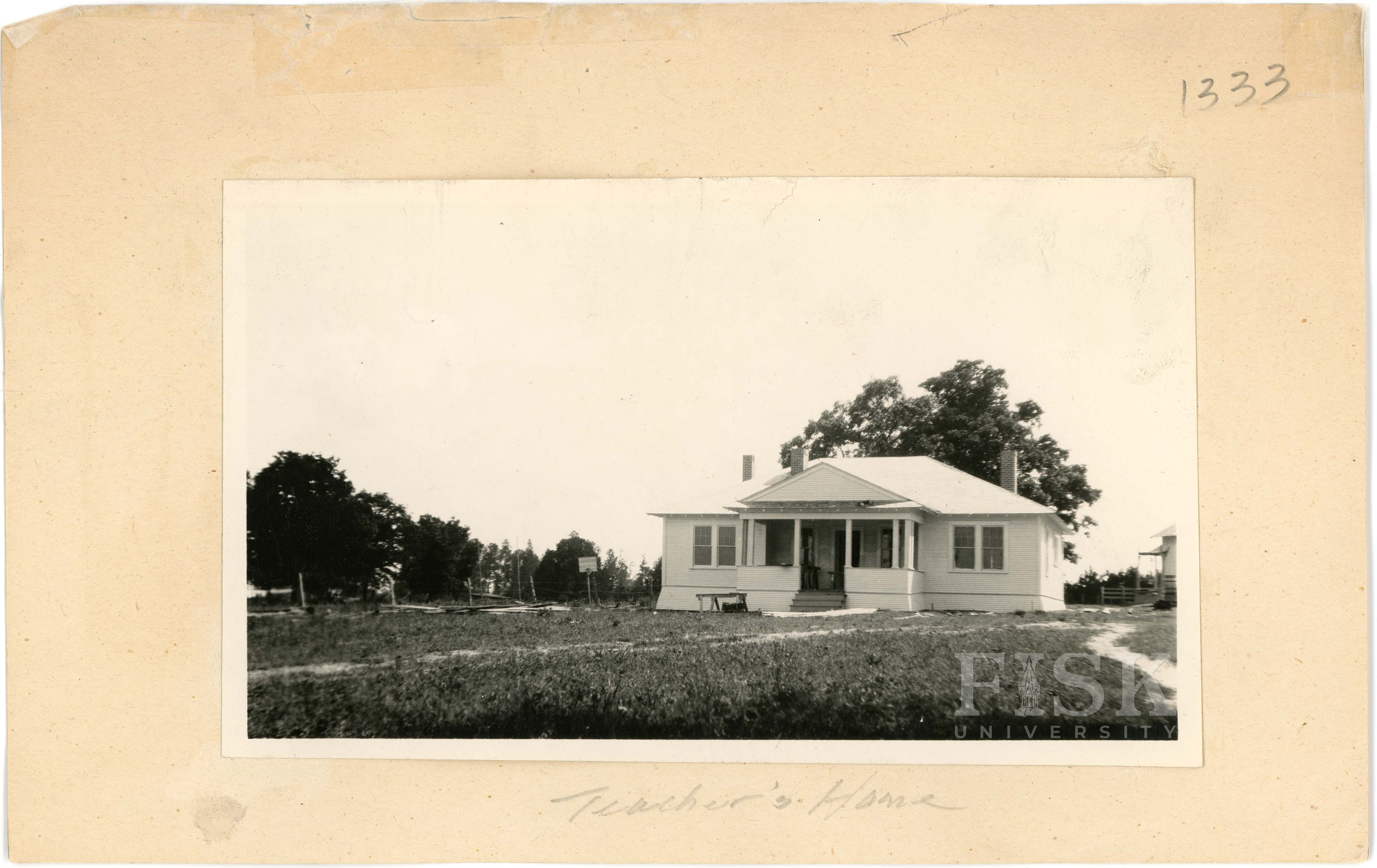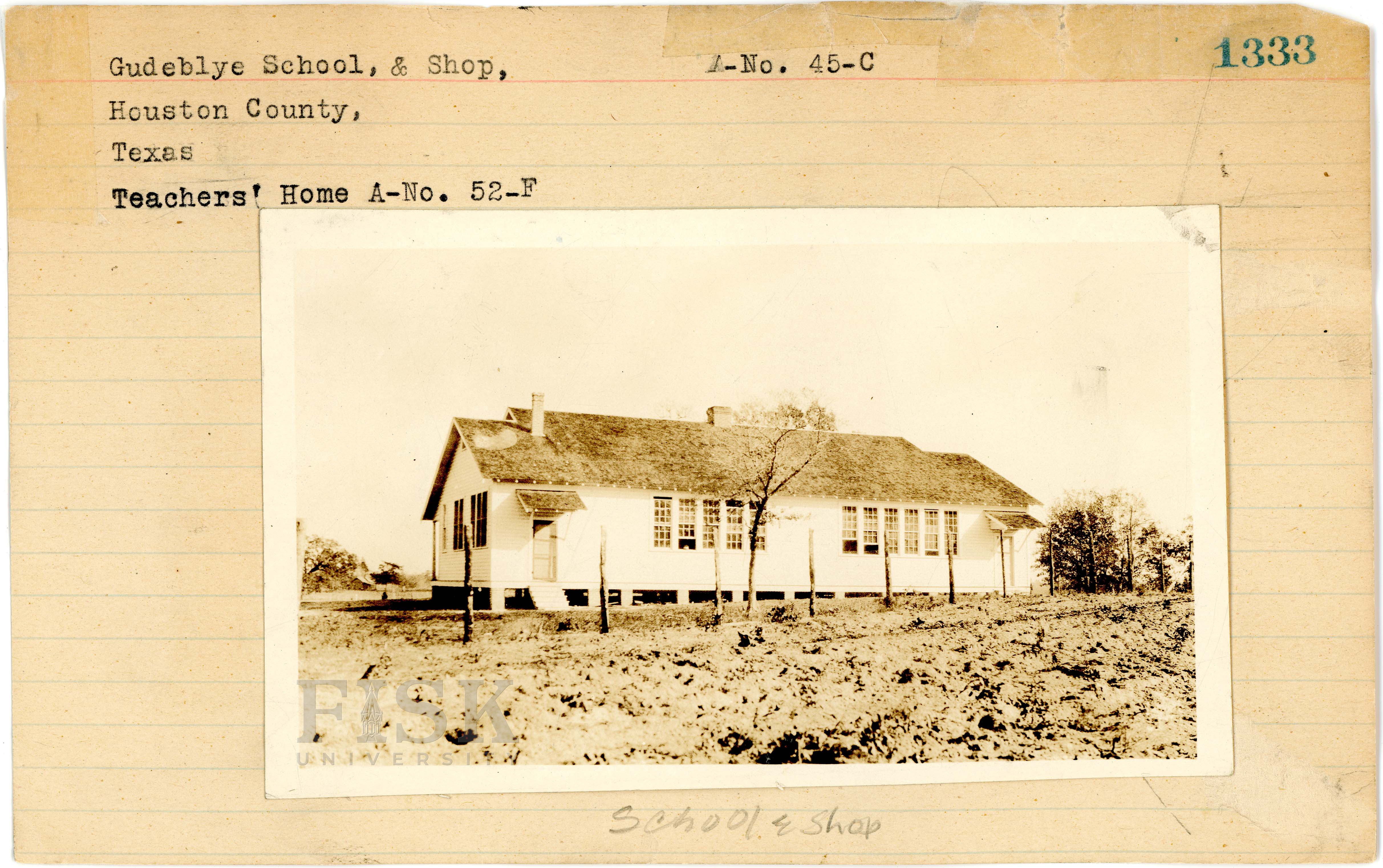 - Photo of Gudeblye School and shop in Houston County, Texas with notes on the front of the school card that say, "Teachers' Home A-No. 52-F" and "school & shop"; photo of the teacher's home at Gudeblye School in Houston County, Texas with a note on the back that says, "Teacher's Home"