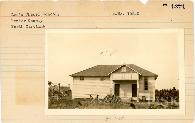 - Photos of Lee's Chapel School in Pender County, North Carolina with a note on the front of the school card that says, "Front" and a note on the back that says, "Back"