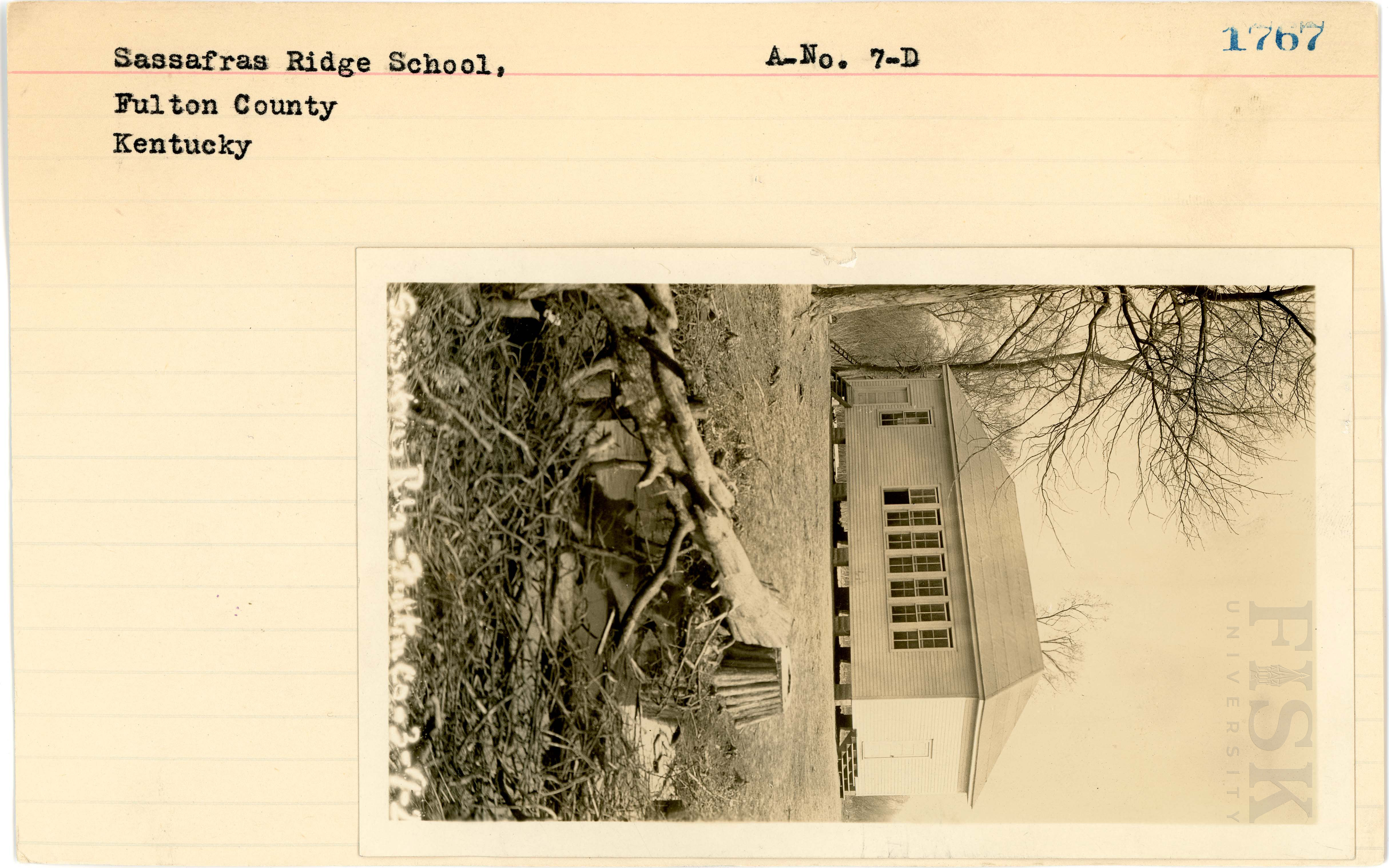 - Photos of Sassafras Ridge School in Fulton County, Kentucky with inscriptions that say, "Sassafras Ridge - Fulton Co. 3-9-25"
