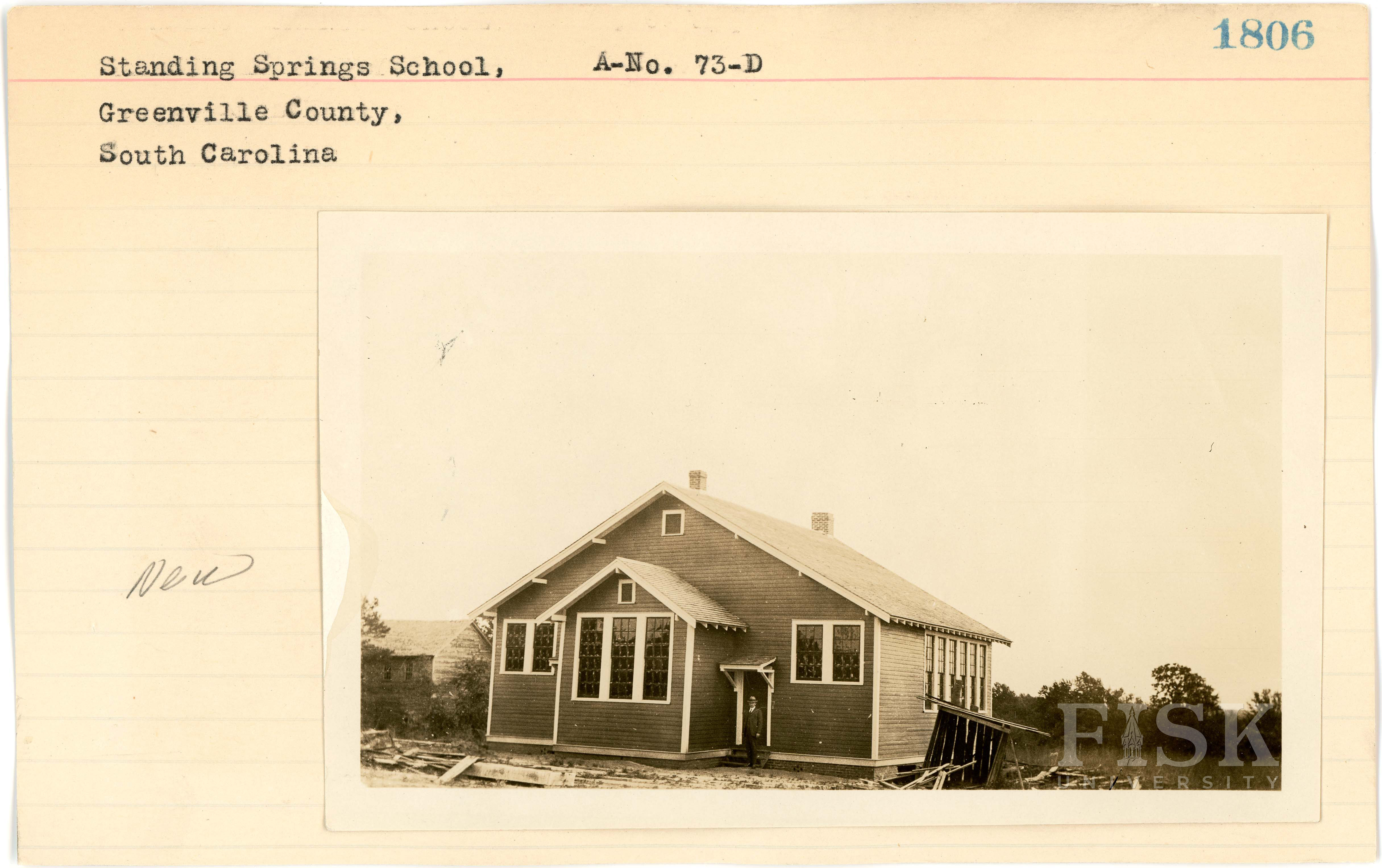 - Photo of Standing Springs School in Greenville County, South Carolina with a note on the front of the school card that says, "New"; a note on the back of the card says, "old"