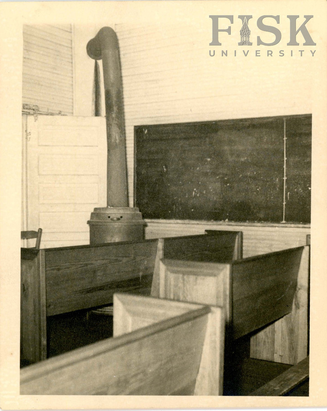 - Photo of interior of classroom with furnace and pew in unknown school