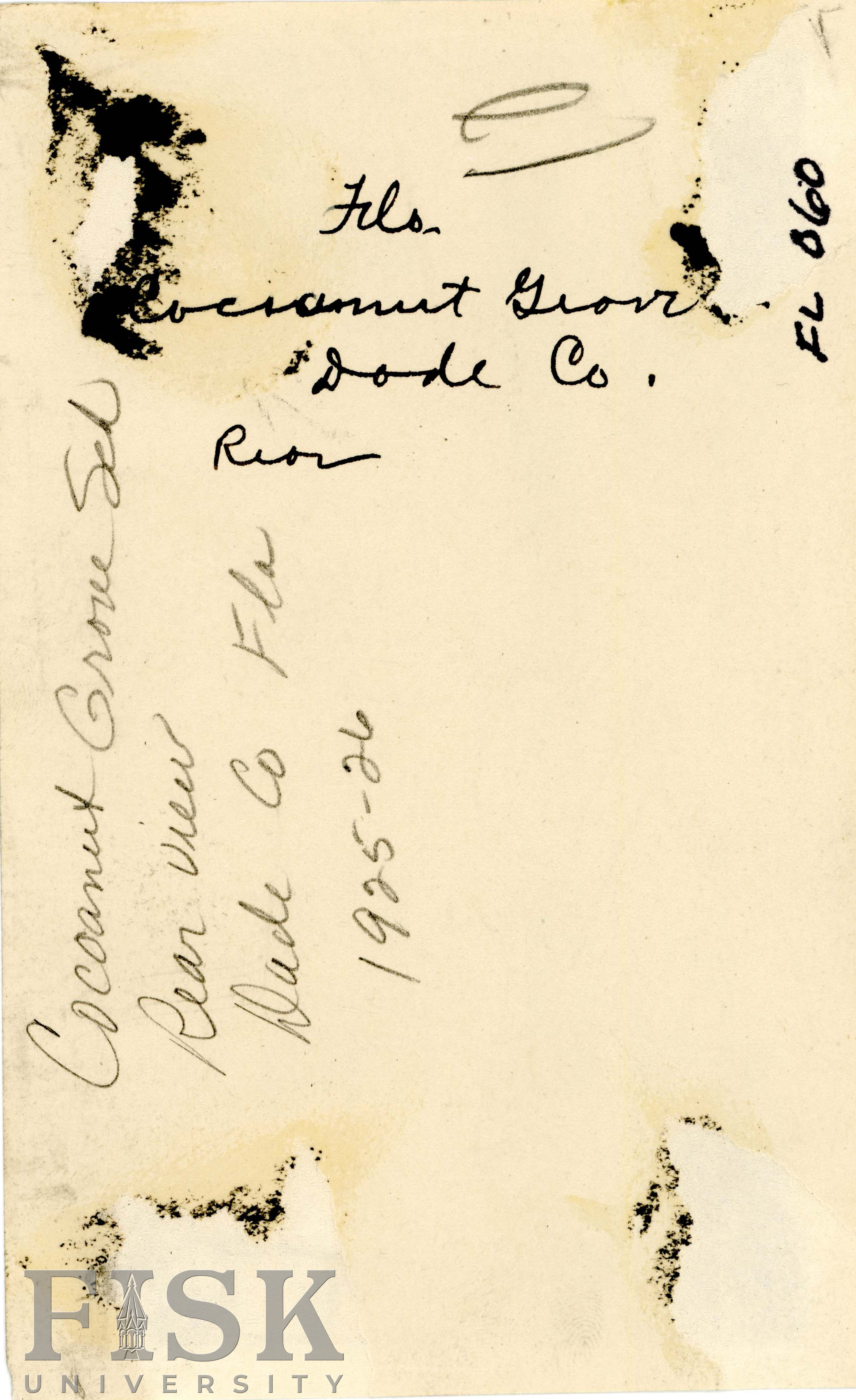 - Photos of the Cocoanut Grove School in Dade County, Florida. Date on the back of the card says, "1925-1926"