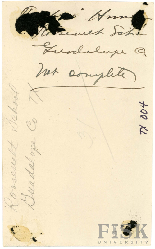 - Photo of the Teacher's Home at Roosevelt School in Guadalupe County, Texas. A note on the back reads, "Not complete."