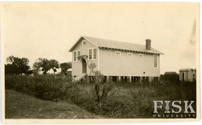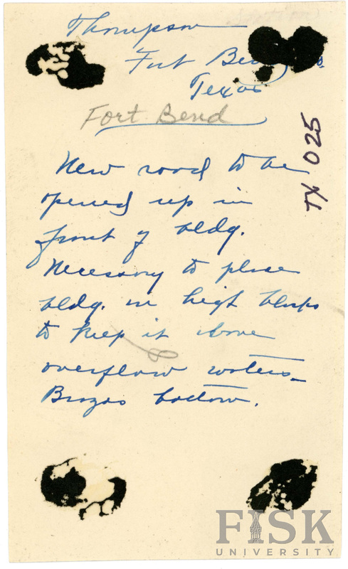 - Photo of the Thompson School in Fort Bend County, Texas. A note on the back reads, "New road to be opened up in front of bldg. Necessary to place bldg. on high blocks to keep it from overflow waters--[illegible] bottom."