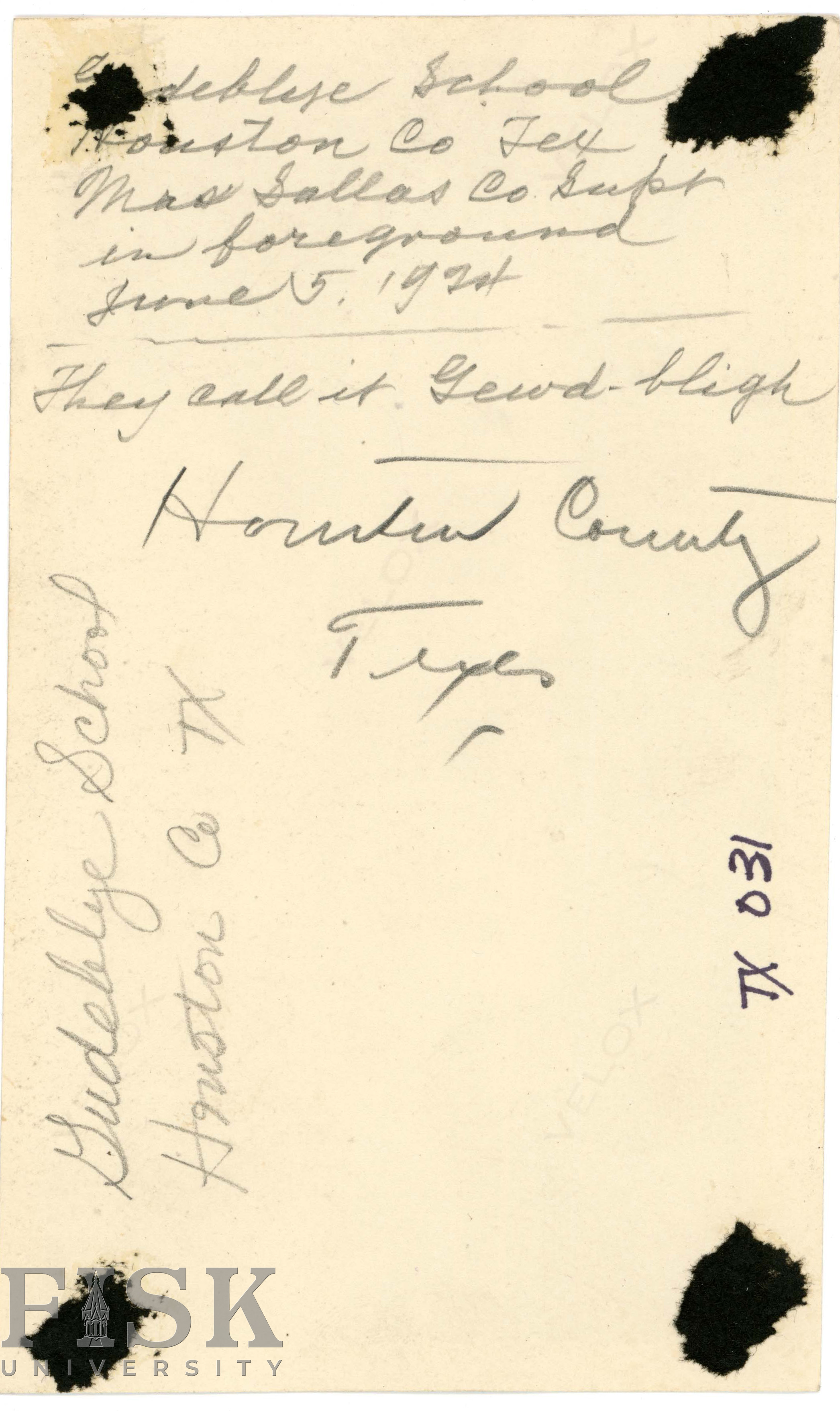 - Photo of the Gudelelye School in Houston County, Texas. A note on the back reads, "Mrs. Sallas Co. Supt. in foreground," and "They call it Gewd-bligh."