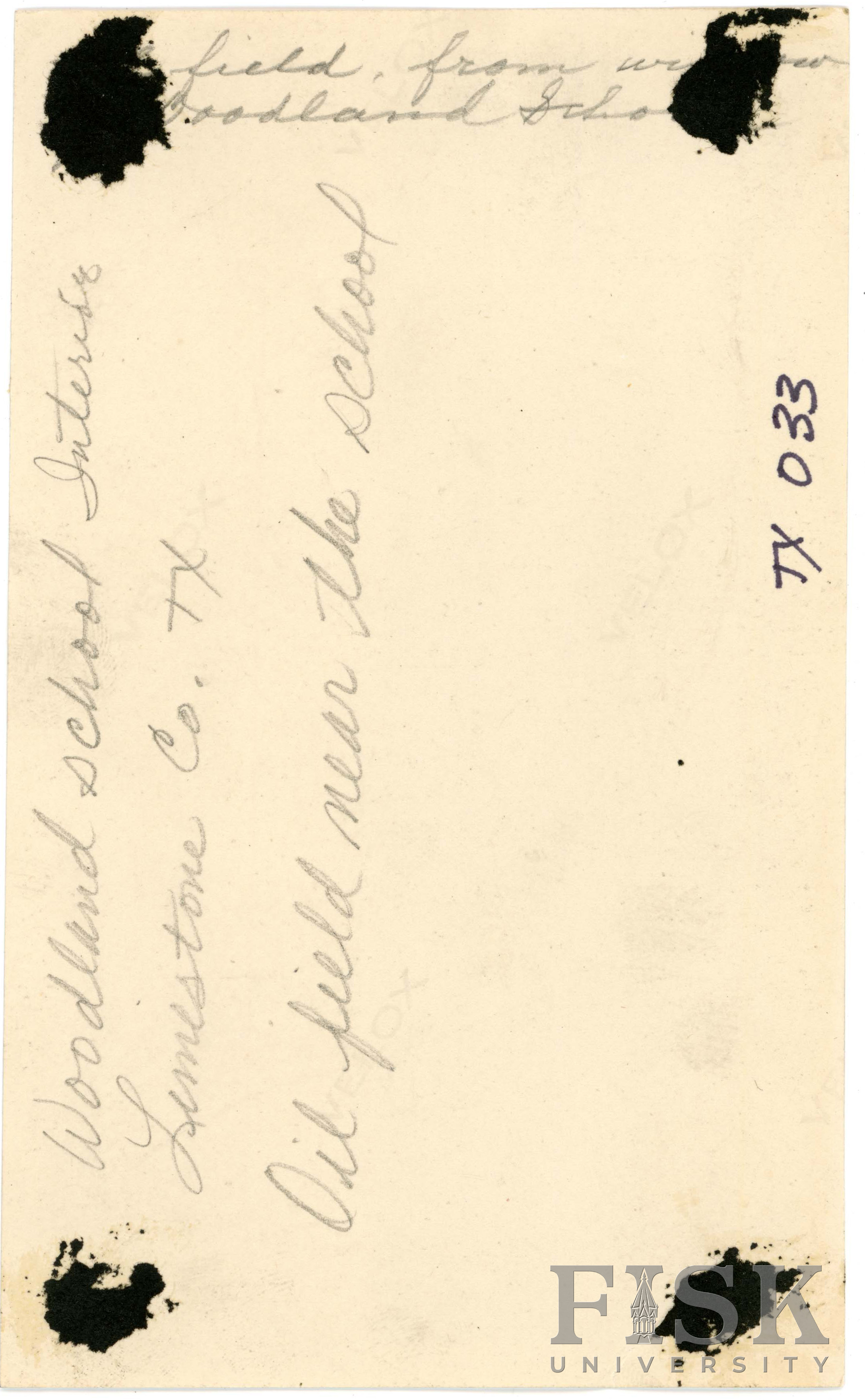 - Photo of Woodland School in Limestone County, Texas. A note on the back says, "Oil field near the school."