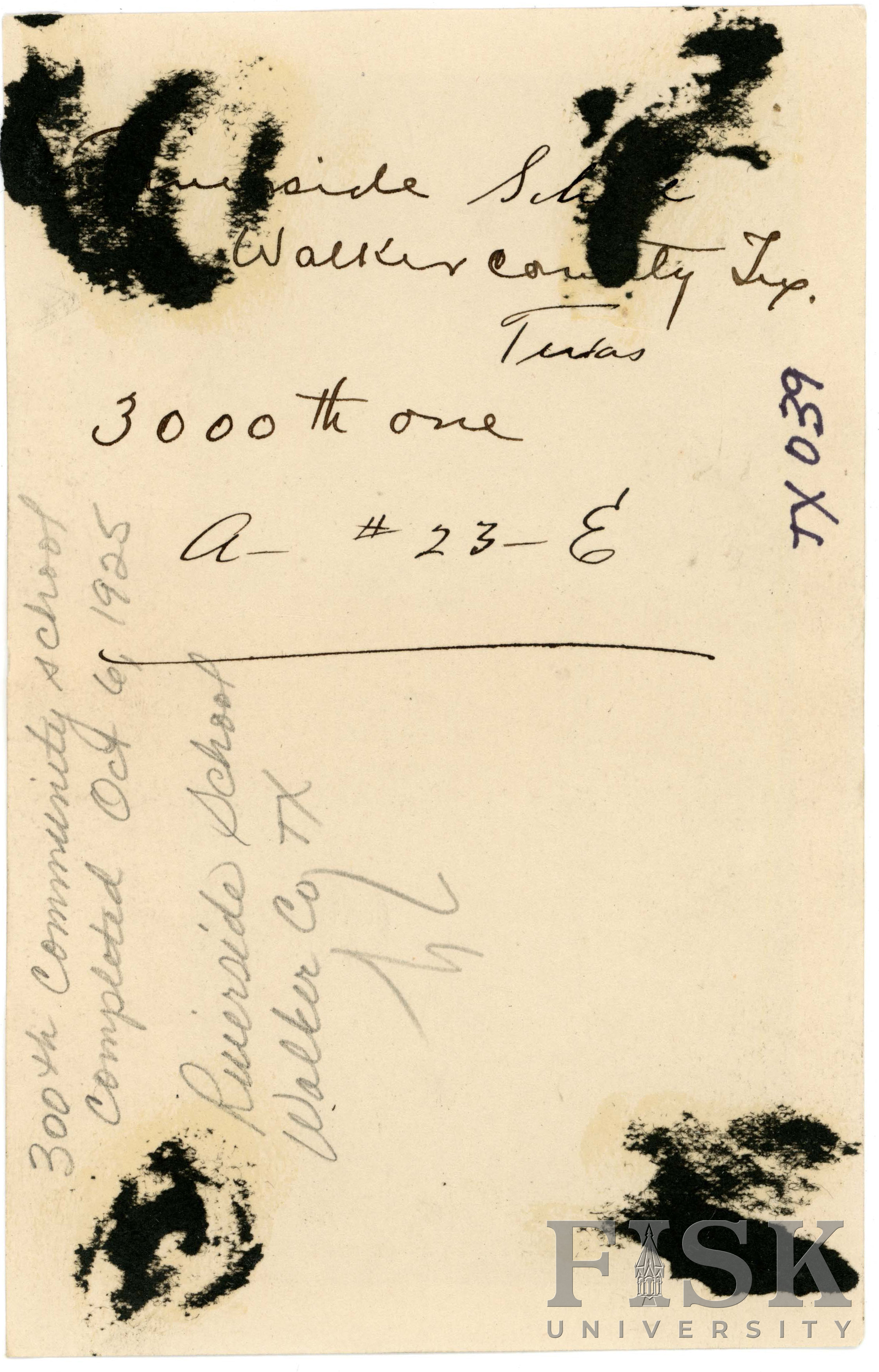 - Photo of Riverside School in Walker County, Texas. A note on the back reads, "3000th community school completed Oct. 6, 1925."