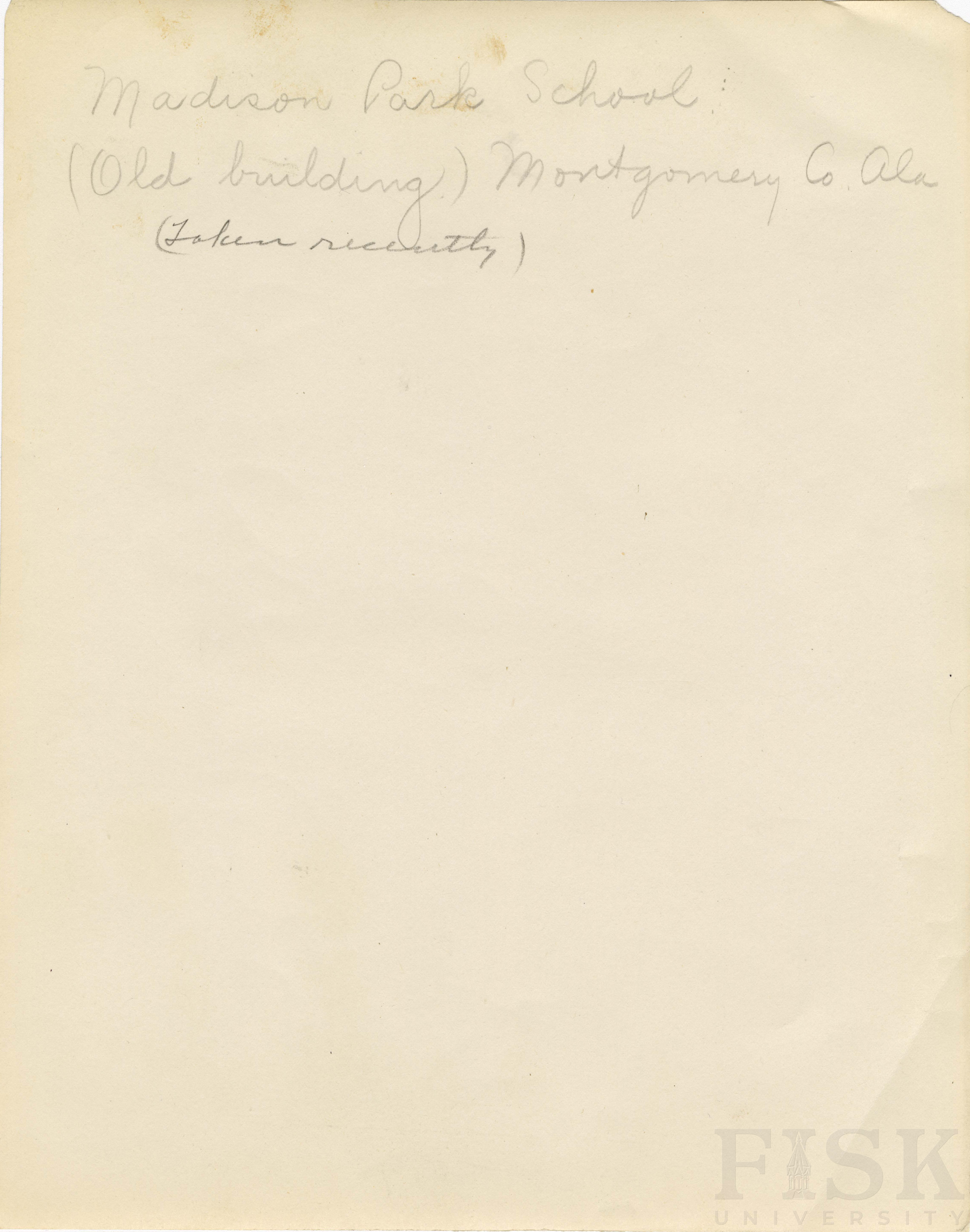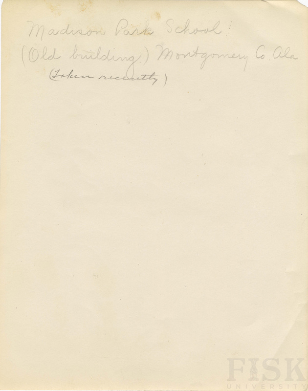 Photo shows the old building of Madison Park School located in Montgomery, Alabama with a note that says, "Madison Park School (old building) Montgomery Co Ala (taken recently)"