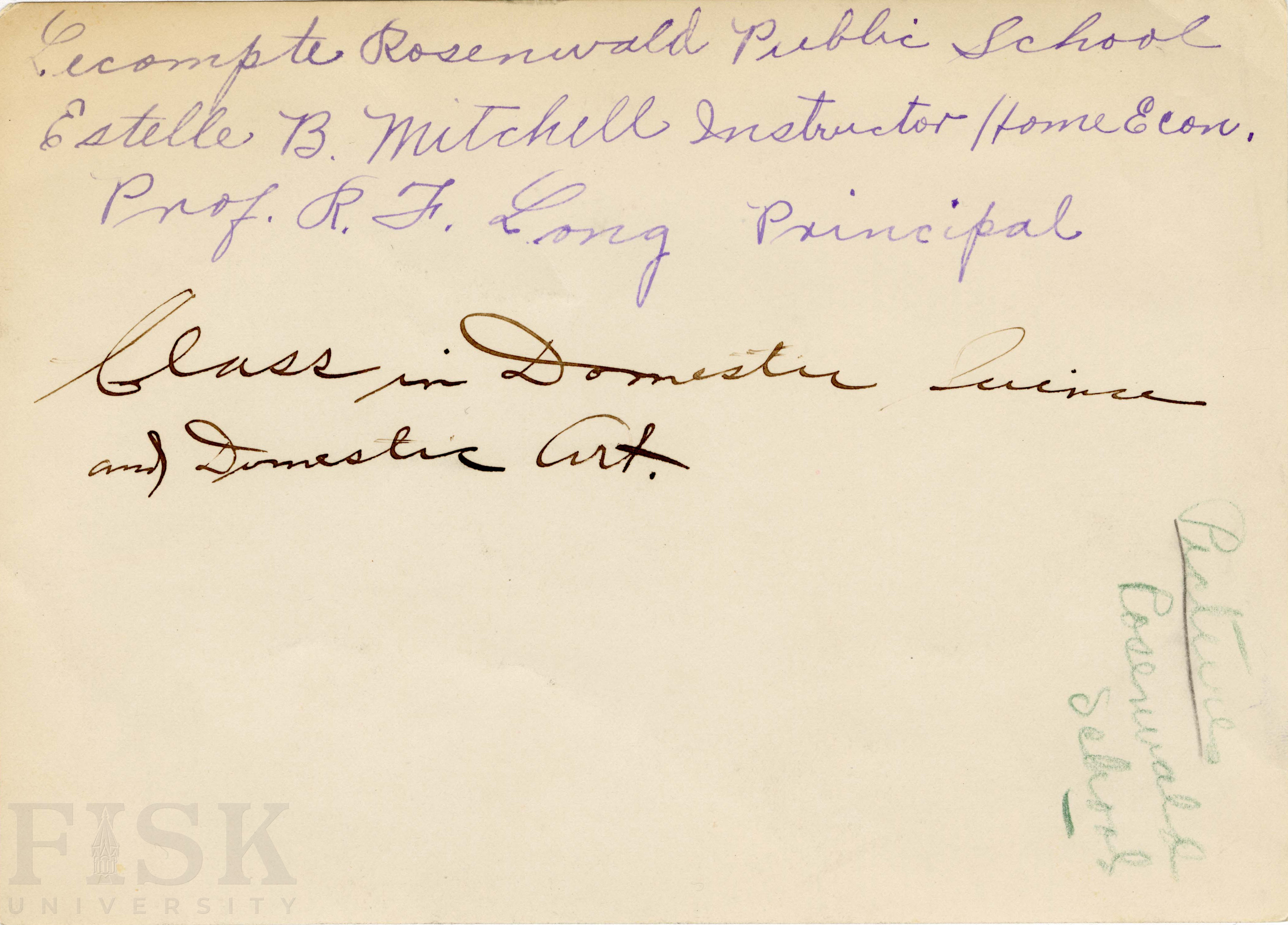 - Photo show school children and instructors at Lecompte Rosenwald School with a note that says, "Lecompte Rosenwald Public School. Estelle B. Mitchell Instructor/ Home Econ. Prof/ R.F. Long Principal. Class in Domestic Science and Domestic Art"