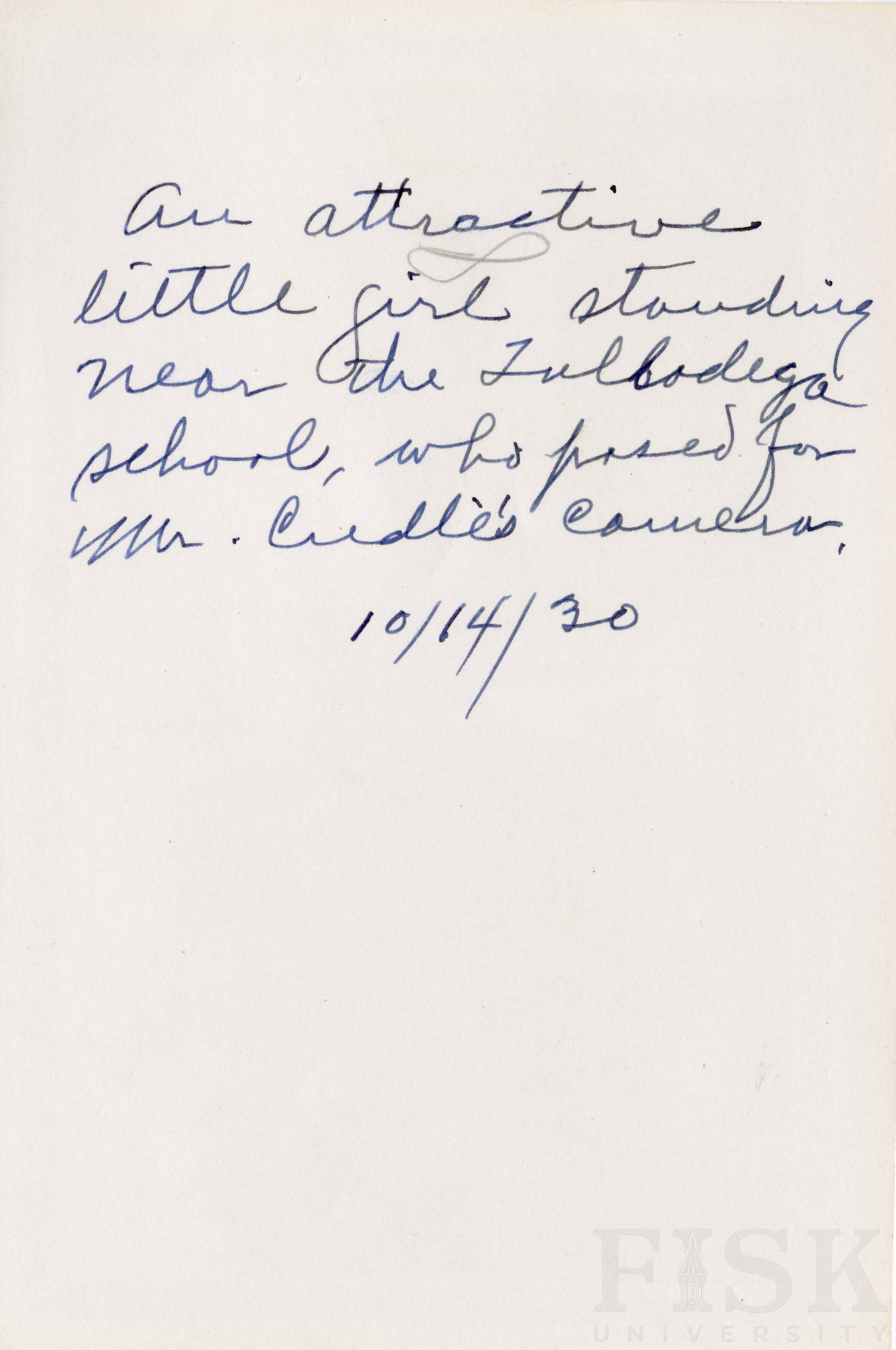Photo shows a young posing for the camera outside of Talledega Rosenwald School. Description says, "An attractive little girl standing near the Talledega School, who posed for Mr. Leedle's camera. 10/14/30"