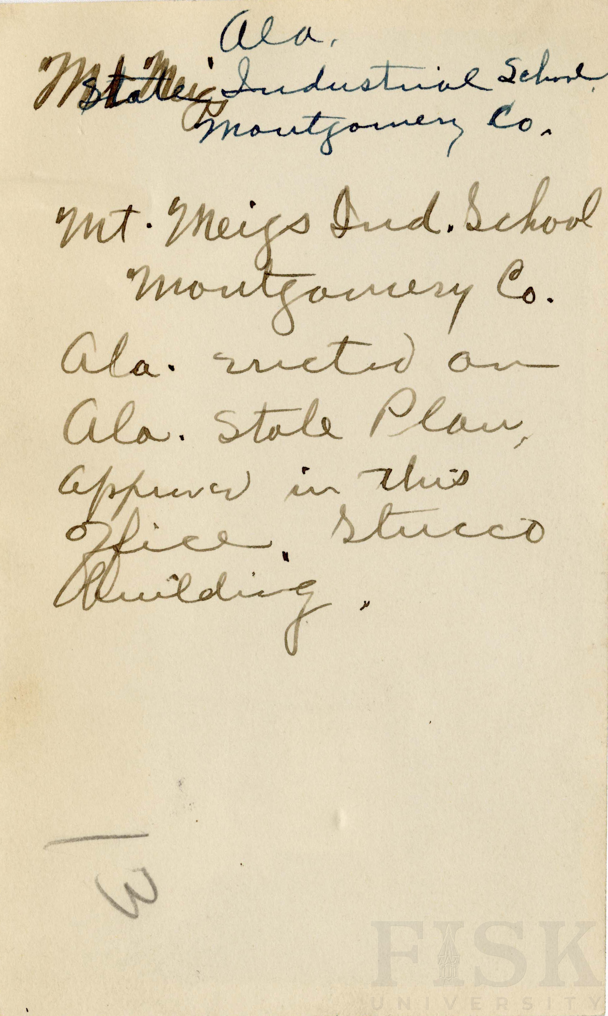 - Photo shows Mt. Meigs Industrial school in Montgomery, Alabama with a note that says, "Ala. Mt. Miegs Ind. School Montgomery Co. Ala. erected on Ala. state plan appeared in this office stucco building"