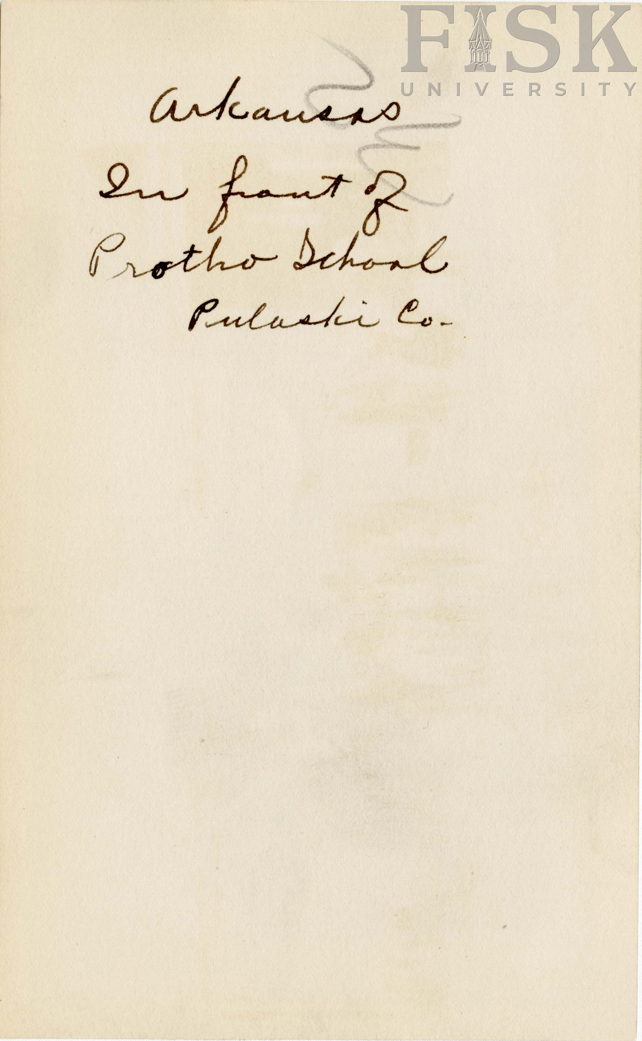 - Photo shows people outside of Protho school in Pulaski, Arkansas with a note that says, "Arkansas in front of Protho school Pulaski Co."