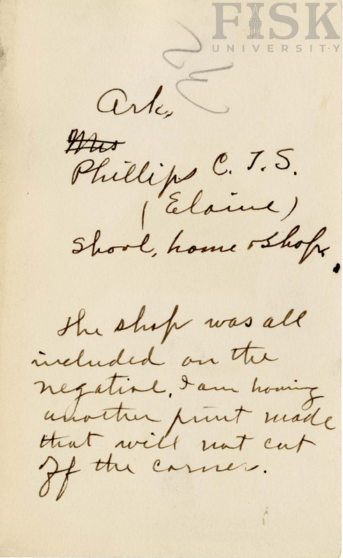 - Photo of the front view of an unidentified school in Elaine, Arkansas with a note that says, "Ark. Phillips (Elaine) School, home shop. The shop was all included on the negative. I am having another print made that will not cut off the corner"