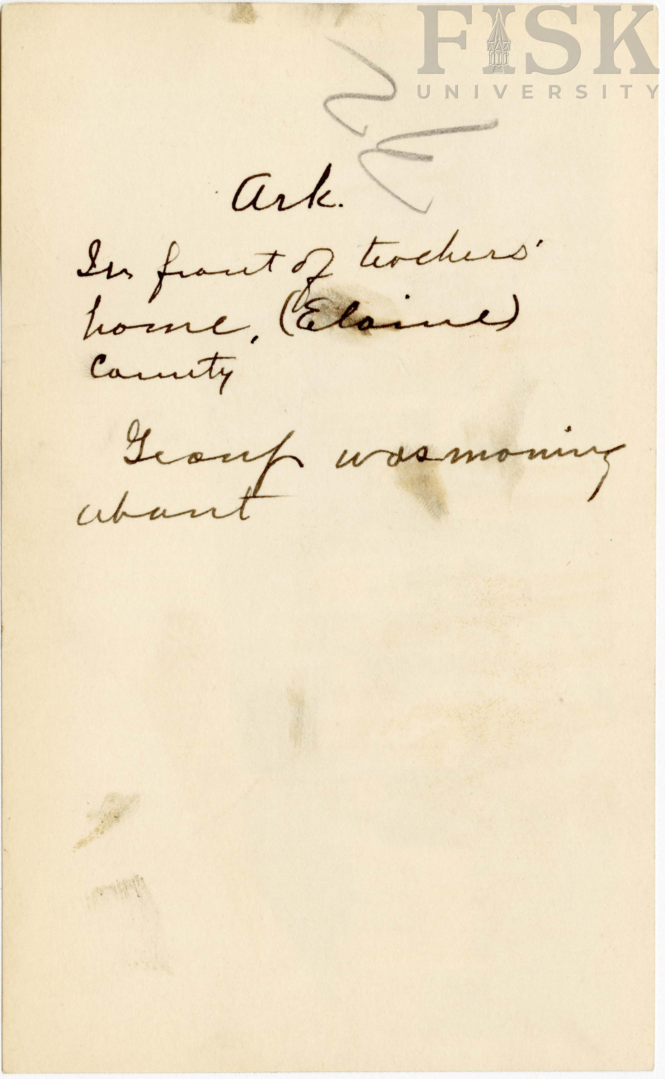 - Photo shows school visitors outside school premises in Elaine County, Arkansas with a note that says, "Ark. In front of teachers home, (Elaine) County. Group was moving about"