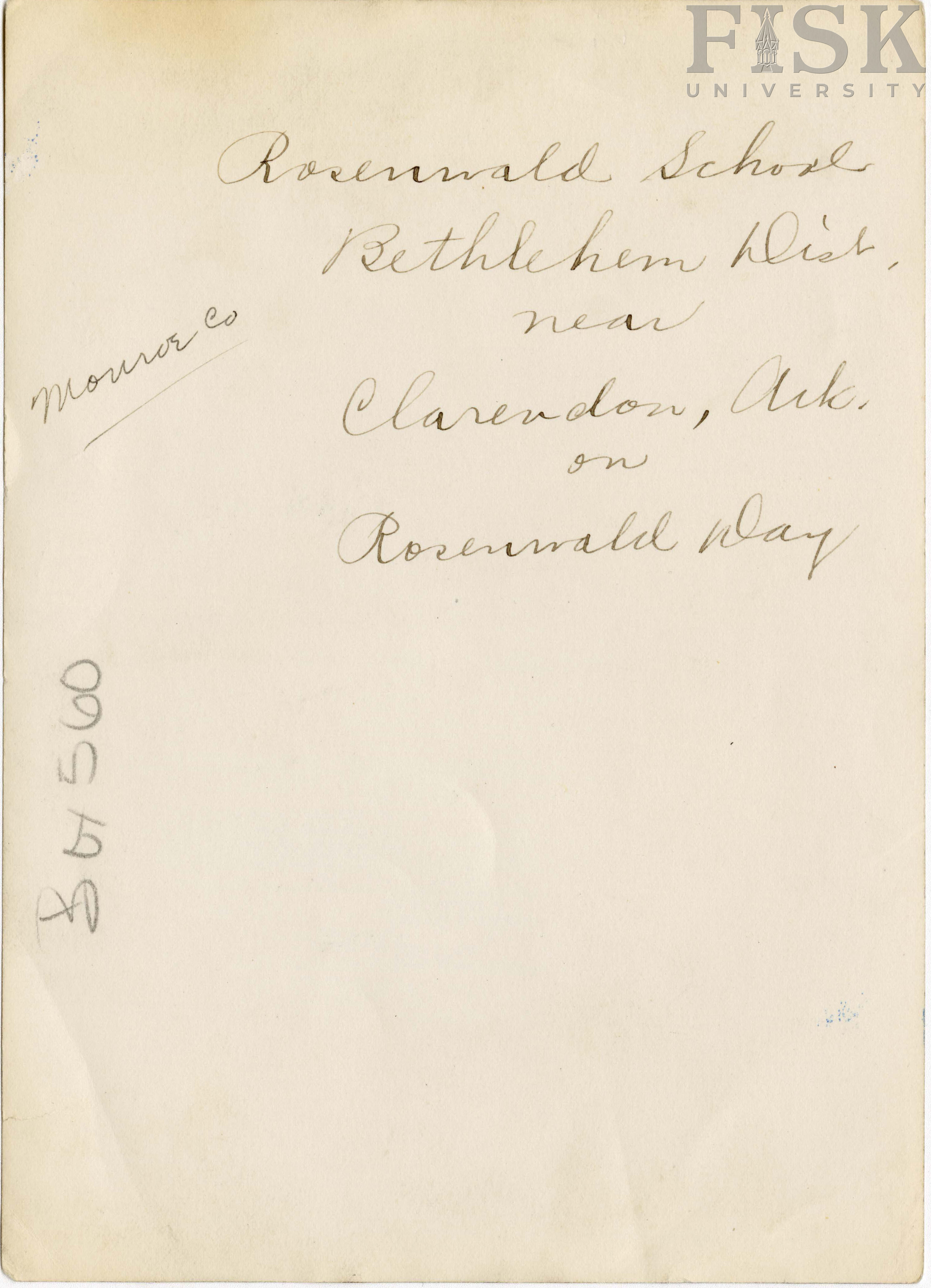 - Photo shows students and staff at Bethlehem school in Monroe, Arkansas, with a note that says, "Rosenwald School, Bethlehem Wish near Clarendon, Ark. on Rosenwald Way"