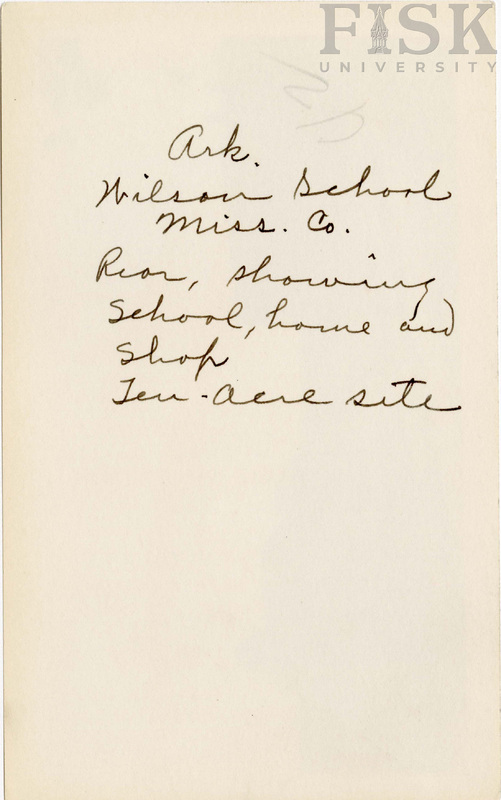 - Photo shows the rear view of Wilson school in Mississippi, Arkansas with a note that says, "Ark. Wilson school Miss. Co. Rear, showing school, home and shop, Ten-acre site"