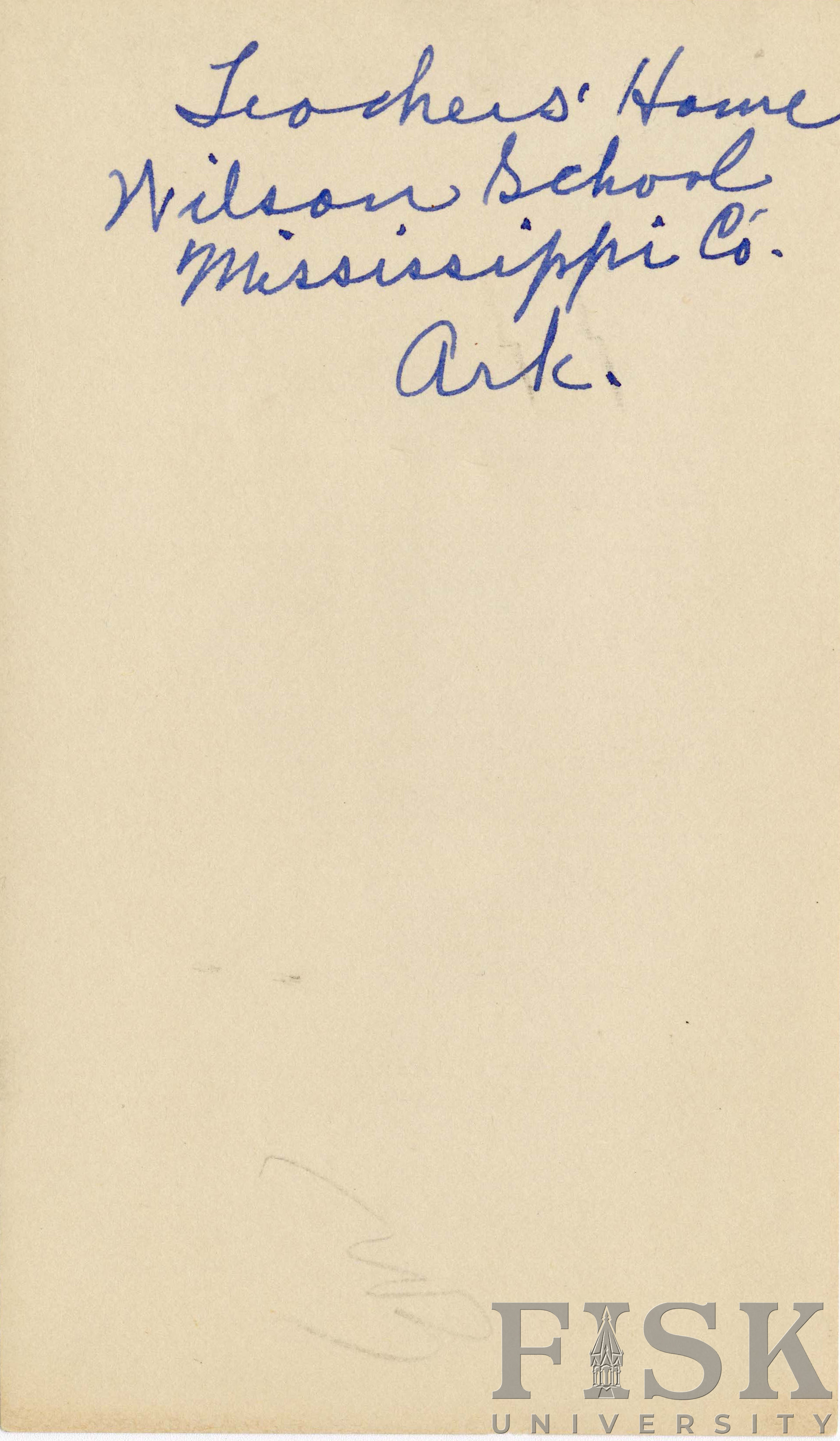 - Photo shows the front view of the teachers' home at Wilson school in Mississippi, Arkansas wih a note that says, "Teachers' Home Wilson School Mississippi Co. Ark."