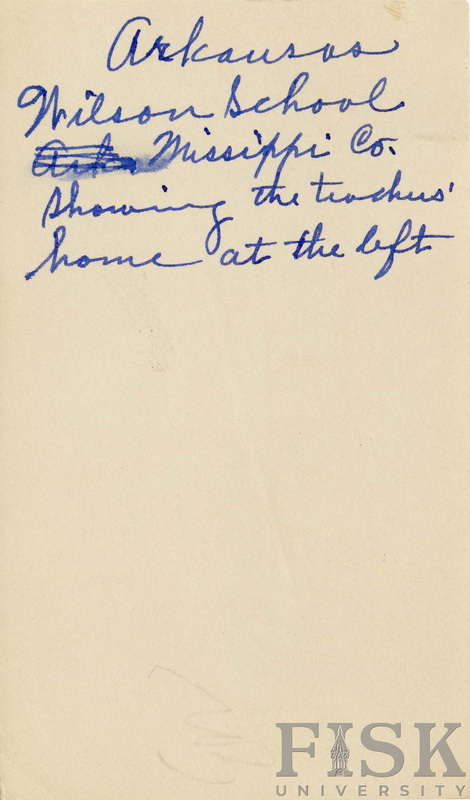 Photo shows Wilson school and the teachers' home in Mississippi, Arkansas with a note that says, "Arkansas Wilson school Missippi Co. showing the teachers' home at the left"